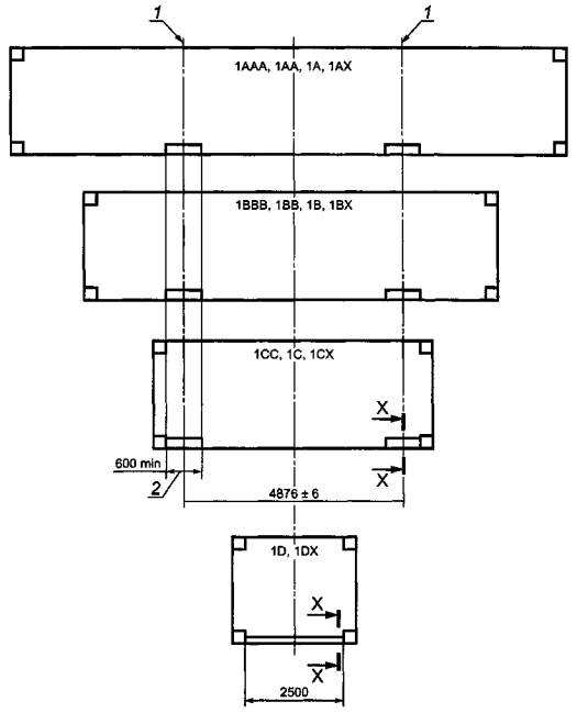 При установке контейнера типа 1А на контейнер типа 1Е нагрузку воспринимают верхние промежуточные фитинги и нижние угловые фитинги |