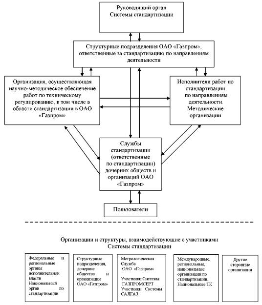 Введение Настоящий стандарт направлен на реализацию в ОАО «Газпром» Федерального закона от 27 декабря 2002 г. № 184-ФЗ «О техническом регулировании» [1], Концепции технического регулирования в ОАО «Газпром» [2] и является результатом пересмотра СТО Газпром 1.0-2005. Стандарт разработан в соответствии с Постановлением Правления ОАО «Газпром» от 01 апреля 2009 г. № 12 «О проводимой ОАО «Газпром» работе по стандартизации и техническому регулированию» по договору № 1521-0350-09-1 лабораторией стандартизации и сертификации ООО «Газпром ВНИИГАЗ» с участием структурных подразделений, дочерних обществ и организаций ОАО «Газпром». Авторский коллектив: Р.С. Кирилина (ОАО «Газпром»), Д.В. Тихомиров, С.Н. Десяткин, Н.Н. Киреенко, О.М. Кирносова, Г.Н. Григорьева (ООО «Газпром ВНИИГАЗ»). СТО Газпром 1.0-2009 СТАНДАРТ ОТКРЫТОГО АКЦИОНЕРНОГО ОБЩЕСТВА «ГАЗПРОМ» СИСТЕМА СТАНДАРТИЗАЦИИ ОАО «ГАЗПРОМ» ОСНОВНЫЕ ПОЛОЖЕНИЯ Дата введения - 2010-07-01 1 Область применения1.1 Настоящий стандарт устанавливает общие правила проведения работ по стандартизации в структурных подразделениях ОАО «Газпром», в его дочерних обществах и организациях (далее ОАО «Газпром» или Общество), организационную структуру Системы стандартизации ОАО «Газпром», основные функции её участников, а также взаимодействие участников Системы стандартизации с метрологической службой ОАО «Газпром», участниками Системы добровольной сертификации ГАЗПРОМСЕРТ, участниками Системы аккредитации химико-аналитических лабораторий дочерних обществ и организаций ОАО «Газпром», сторонними организациями. 1.2 Положения настоящего стандарта обязательны для применения структурными подразделениями, дочерними обществами и организациями ОАО «Газпром». 2 Нормативные ссылкиВ настоящем стандарте использованы нормативные ссылки на следующие стандарты: ГОСТ 1.1-2002 Межгосударственная система стандартизации. Термины и определения ГОСТ Р 1.0-2004 Стандартизация в Российской Федерации. Основные положения ГОСТ Р 1.1-2005 Стандартизация в Российской Федерации. Технические комитеты по стандартизации. Порядок создания и деятельности ГОСТ Р 1.4-2004 Стандартизация в Российской Федерации. Стандарты организаций. Общие положения ГОСТ Р 1.12-2004 Стандартизация в Российской Федерации. Термины и определения СТО Газпром 1.1-2009 Система стандартизации ОАО «Газпром». Стандарты ОАО «Газпром». Порядок разработки, утверждения, учета, изменения и отмены СТО Газпром 1.2-2009 Система стандартизации ОАО «Газпром». Планы разработки документов по техническому регулированию в ОАО «Газпром». Порядок формирования, утверждения и реализации СТО Газпром 1.3-2009 Система стандартизации ОАО «Газпром». Информационный фонд документов по техническому регулированию ОАО «Газпром». Порядок формирования и ведения СТО Газпром 1.4-2009 Система стандартизации ОАО «Газпром». Службы стандартизации дочерних обществ и организаций ОАО «Газпром». Общие положения СТО Газпром 1.5-2006 Система стандартизации ОАО «Газпром». Комплекс стандартов ОАО «Газпром» на системы менеджмента качества. Основные положения СТО Газпром 1.6-2006 Система стандартизации ОАО «Газпром». Стандартизация терминов и определений в ОАО «Газпром». Общие положения СТО Газпром 1.7-2007 Система стандартизации ОАО «Газпром». Метрологическая экспертиза проектов документов Системы стандартизации ОАО «Газпром». Организа