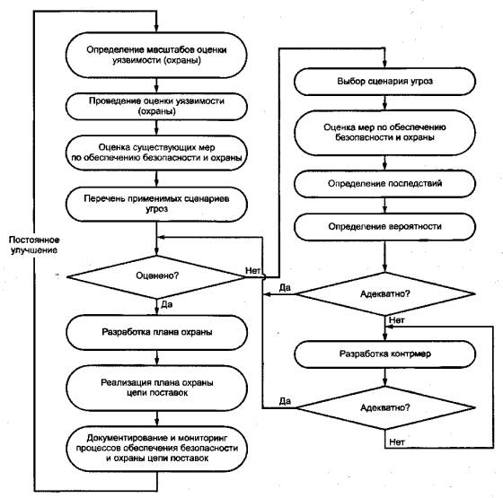 Дата введения - 2010-07-01 1 Область примененияВ настоящем стандарте приведены рекомендации и требования для организаций - участников цепи поставок по: - разработке и внедрению процессов обеспечения безопасности и охраны цепи поставок; - документированному установлению минимального уровня охраны для всей цепи поставок или ее части; - содействию в достижении соответствия критериям, предъявляемым к Уполномоченному экономическому оператору, сформулированным в Рамочных стандартах безопасности и облегчения мировой торговли [1] Всемирной таможенной организации, и существующим законодательным и нормативным актам, регламентирующим обеспечение безопасности и охраны цепи поставок. Примечание - Только федеральный орган исполнительной власти по контролю и надзору в области таможенного дела может присвоить организации статус Уполномоченного экономического оператора при условии ее соответствия требованиям в области обеспечения безопасности и охраны цепи поставок и наличия соответствующих подтверждающих документов. В дополнение настоящий стандарт устанавливает требования к документации, по которой возможно проводить оценку соответствия. Организация, принявшая на себя ответственность по настоящему стандарту, должна: - определить участки цепи поставок, на которых организация будет обеспечивать безопасность и охрану (см. 4.1); - провести там оценку уязвимости (охраны) и разработать адекватные контрмеры; - разработать и внедрить План обеспечения безопасности (охраны) цепи поставок; - подготовить персонал, ответственный за охрану (службы охраны), в соответствии с его должностными обязанностями. 2 Нормативные ссылкиВ настоящем стандарте использованы нормативные ссылки на следующие документы: ГОСТ Р ИСО 9001-2008 Системы менеджмента качества. Требования ГОСТ Р ИСО 14001-2007 Системы экологического менеджмента. Требования и руководство по применению ГОСТ Р 53660-2009 Суда и морские технологии. Оценка охраны и разработка планов охраны портовых средств Международная конвенция по охране человеческой жизни на море 1974 года, с поправками, Международной морской организации. 3 Термины и определенияДля целей настоящего стандарта применяются следующие термины и определения: 3.1 уполномоченные должностные лица (appropriate law enforcement and other government officials): Должностные лица органов исполнительной власти и подведомственных им организаций, наделенные соответствующими полномочиями по решению вопросов в отношении цепи поставок или отдельных ее участков. 3.2 активы (asset(s)): Предприятие, технологическое оборудование, здания, наземные, водные и воздушные транспортные средства и другие элементы инфраструктуры, а также относящиеся к ним системы, которые имеют отличительную и измеримую деловую функцию или услугу. Примечание - Это определение включает в себя любую информационную систему, являющуюся частью обеспечения безопасности и охраны и применения менеджмента безопасности. 3.3 Уполномоченный экономический оператор (authorized economic operator): Участник внешнеэкономической деятельности, чья деятельность получила одобрение федерального органа исполнительной власти по контролю и надзору в области таможенного дела, как соответствующая нормам Всемирной таможенной организации или стандартам обеспечения безопасности и охраны цепи поставок. Примечание 1 - Уполномоченный эконо