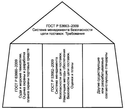 Рисунок 1 - Соотношение между настоящим стандартом и другими соответствующими стандартами Данные требования предназначены для применения в тех случаях, когда организации требуется надежный менеджмент цепей поставок. Официальный подход к менеджменту безопасности может непосредственно способствовать деловым возможностям организации и доверию к ней. Соответствие требованиям не освобождает от юридических обязательств. По желанию организации соответствие своей системы менеджмента безопасности положениям данных требований может быть проверено в процессе внешнего или внутреннего аудита. Эти требования основаны на формате Международной организации по стандартизации, принятом как ГОСТ Р ИСО 14001-2007, который предусматривает подход к системам менеджмента на основе риска. Однако организации, которые приняли последовательный подход к системам менеджмента (например, ГОСТ Р ИСО 9001-2008), могут использовать существующую систему менеджмента как фундамент для внедрения системы менеджмента безопасности, изложенные в данных требованиях. Данные требования не призваны дублировать требования федеральных органов исполнительной власти и стандарты относительно менеджмента безопасности цепи поставок, по которым организация была уже сертифицирована или проверена на соответствие. Такая проверка может быть выполнена приемлемой организацией первой, второй или третьей стороны. Примечание - Эти требования основываются на методологии, известной как цикл «Plan - Do - Check - Act» (PDCA). Цикл PDCA можно описать следующим образом: - планирование (plan) - определение целей и порядка действий, необходимых для достижения результатов, соответствующих политике организации в области безопасности; - осуществление (do) - реализация запланированных процессов; - проверка (check) - мониторинг и измерение процессов в сравнении с политикой, целями, нормативными и иными регламентирующими безопасность требованиями и сообщений о результатах; - действие (act) - проведение мероприятий, направленных на постоянное улучшение работы системы менеджмента безопасности. НАЦИОНАЛЬНЫЙ СТАНДАРТ РОССИЙСКОЙ ФЕДЕРАЦИИ