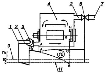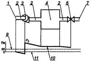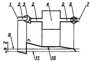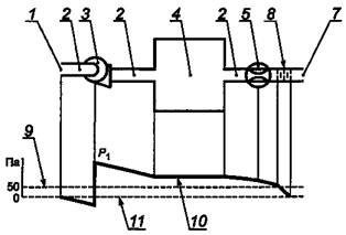 Р1 --давление защитного газа (определяется по сопротивлению потока через газопровод, части внутри оболочки и в ряде случаев - через дроссельную заслонку); 1 - вход защитного газа (в безопасной зоне); 2 - газопровод; 3 - вентилятор; 4 - оболочка; 5 - дроссельная заслонка (в том случае, когда требуется поддерживать избыточное давление); 6 - (не используется на этом рисунке); 7 - выход защитного газа; 8 - (не используется на этом рисунке); 9 - избыточное давление; 10 - внутреннее давление; 11 - наружное давление