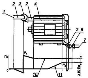 Р4 - давление защитного газа (определяется по сопротивлению внутренних частей потоку и по наибольшему значению давления наружного воздуха); Р5 - давление наружного воздуха, создаваемое наружным охлаждающим вентилятором; 1 - вход защитного газа, 2 - газопровод; 3 - вентилятор; 4 - оболочка; 5 - (не используется на этом рисунке); 6 - выходной клапан; 7 - выход защитного газа; 8 - (не используется на этом рисунке); 9 - (не используется на этом рисунке); 10 - внутреннее давление; 11 - внешнее давление