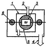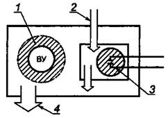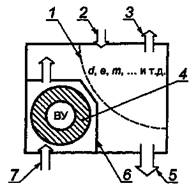 1 - внутренняя перегородка; 2 - вход продувочного газа; 3 - неповреждаемые части встроенной системы; 4 - выход продувочного газа; 5 - расположение ВУ; 6 - потенциальный источник утечки с номинальной зоной разбавления