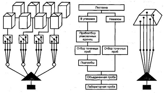 где r - интервал, рассчитанный по количеству захватывающих устройств; mq - масса ферросплава, перемещаемая одним захватывающим устройством за один цикл, кг. 5.6 Отбор проб от упакованной поставки5.6.1 Отбор проб от упакованной поставки проводят в две стадии (двухстадийный отбор проб). На первой стадии следует отобрать требуемое количество упаковочных единиц Мр. На второй стадии из каждой отобранной упаковочной единицы следует отобрать требуемое число точечных проб ns (5.3.5). 5.6.2 Упаковочные единицы отбирают систематическим или произвольным методом с использованием таблиц случайных чисел, если единицы пронумерованы. 5.6.3 Если в партии упаковочных единиц Mt меньше, чем заданное количество упаковочных единиц Мр то точечные пробы отбирают от всех единиц. При этом количество точечных проб от каждой упаковочной единицы определяют путем деления требуемого количества точечных проб на количество упаковочных единиц в ней. Результаты деления округляют до ближайшего большего целого числа. 5.6.4 Методы отбора точечных проб от упаковочных единиц должны соответствовать 5.5. Перед отбором точечных проб содержание упаковочной единицы рекомендуется высыпать на чистую площадку. 5.6.5 Если массы ферросплава, находящегося в упаковочной единице, недостаточно для отбора требуемого количества точечных проб, то пробой является вся масса упаковочной единицы. 5.7 Методы объединения точечных проб и контроля точности опробования5.7.1 Точечные пробы, отобранные от одной поставки, объединяют в одну объединенную пробу. 5.7.2 Если необходима точность определения показателей качества поставки больше, чем указано в соответствующих стандартах, то анализу подвергают каждую точечную пробу или подпробу по отдельности без объединения. 5.7.3 Если поставку делят на несколько частей и от каждой части отбирают несколько точечных проб, то: а) точечные пробы каждой части объединяют в подпробы пропорционально массе каждой части; каждую подпробу подготавливают и анализируют по отдельности; b) точечные пробы каждой части объединяют в подпробы, которые на соответствующей стадии подготовки объединяют в объединенную пробу для анализа при условии, что количество точечных проб, составляющих каждую подпробу, почти одинаковое. 5.7.4 Если поставка состоит из нескольких упаковочных единиц, то: а) точечные пробы каждой упаковочной единицы объединяют в подпробы пропорционально массе каждой упаковочной единицы; каждую подпробу подготавливают и анализируют по отдельности; б) точечные пробы каждой упаковочной единицы объединяют в подпробы, которые на соответствующей стадии подготовки объединяют в объединенную пробу для анализа, при условии, что масса каждой упаковочной единицы или количество точечных проб, составляющих каждую подпробу, почти одинаковые. 5.7.5 Другие способы объединения точечных проб, а также контроля прецизионности опробования поставок приведены в приложении В. 6 Подготовка проб6.1 Последовательность подготовки проб6.1.1 Подготовку пробы для испытания химического состава проводят из материала точечных проб, подпроб или объединенной пробы. 6.1.2 Процесс подготовки пробы заключается в последовательных операциях дробления, перемешивания и сокращения материала пробы. 6.1.3 Крупность частиц и масса пробы для испытания должны быть указаны в стандартах на опробование отдельн