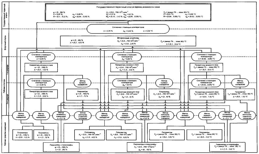 the uniformity of measurements. Дата введения - 2011-07-01 1 Область примененияНастоящий стандарт распространяется на государственную поверочную схему для средств измерений влажности газов (см. рисунок А.1) и устанавливает назначение государственного первичного эталона единиц влажности газов (далее - государственный первичный эталон), его метрологические характеристики, состав и порядок передачи размеров единиц: относительной влажности газов - процент (%), молярной (объемной) доли влаги - миллионная доля (млн-1), температуры точки росы/ инея - градус Цельсия (°С) от государственного первичного эталона с помощью вторичных и рабочих эталонов средствам измерений с указанием погрешностей и основных методов поверки. Взаимосвязь различных единиц влажности газов и формулы пересчета приведены в таблице Б.1. 2 Термины, определения и обозначения2.1 В настоящем стандарте применены термины с определениями в соответствии с [1] и [2]. 2.2 В настоящем стандарте применены следующие обозначения: φ - относительная влажность газа; Td - температура точки росы/инея, К; хn - молярная доля влаги; xnw - молярная доля влаги в состоянии насыщения; xv -объемная доля влаги; ev - давление чистого водяного пара, Па; evw - давление чистого насыщенного водяного пара, Па; fv - повышающий коэффициент влажного газа; nv - количество вещества водяного пара, моль; na - количество вещества сухого газа, моль; Vv - парциальный объем водяного пара, содержащегося во влажном газе, м3; V - объем влажного газа, м3; Р - давление влажного газа, Па; T - температура влажного газа, К. 3 Государственный первичный эталон3.1 Государственный первичный эталон предназначен для воспроизведения и хранения единиц относительной влажности газов, молярной доли влаги, температуры точки росы/инея и передачи размера их единиц с помощью рабочих эталонов средствам измерений в целях обеспечения единства измерений влажности газов. 3.2 В основу измерений величин влажности газов должны быть положены размеры единиц, воспроизводимые государственным первичным эталоном. 3.3 Государственный первичный эталон состоит из комплекса следующих средств измерений: - эталонный генератор влажного газа (метод двух давлений - при воспроизведении единицы относительной влажности газа, метод фазового равновесия - при воспроизведении единиц температуры точки росы/инея и молярной доли влаги) для положительных температур; - эталонный генератор влажного газа (метод двух давлений - при воспроизведении единицы относительной влажности газа, метод фазового равновесия - при воспроизведении единиц температуры точки росы/инея и молярной доли влаги) для отрицательных температур; - генератор сухого газа; - комплекс аппаратуры и средств подготовки газа; - набор прецизионных гигрометров для контроля стабильности работы эталонных генераторов влажного газа; - измерительно-вычислительный комплекс. 3.4 Государственный первичный эталон воспроизводит размеры единиц влажности газов при температуре от минус 60 °С до плюс 90 °С. 3.5 Диапазон значений относительной влажности газов φ, воспроизводимых эталоном, составляет от 5% до 98%. Диапазон значений молярной доли влаги хn, воспроизводимых эталоном, составляет от 0,6 до 700·103 млн-1. Диапазон значений температуры точки росы/инея Td, воспроизводимых эталоном, составляет от минус 79 °С до плюс 90 °С. 3.6 Государственный первичный эталон обеспечи