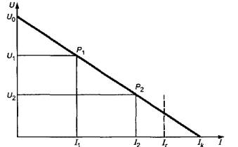 P1, P2 - точки, построенные при измерении нагрузочных характеристик Рисунок 2 - Нагрузочные характеристики генераторов тока 4.2.1 Технические данные Поставщик генераторов тока должен предоставлять следующие данные: - напряжение при разомкнутой цепи U0 (эффективное значение); - ток короткого замыкания 1k(эффективное значение); - номинальный ток Ir (эффективное значение); - рабочий цикл при максимальной мощности (в случае отличия от указанного в 4.2); - максимальную длительность подачи тока (в случае отличия от указанной в 4.2); - возможные формы кривой тока; - метод контроля тока и его влияние на форму кривой; - рабочий диапазон и уровни последовательной настройки; - метод обеспечения постоянства тока (при наличии); - тип измерительного прибора (цифровой, аналоговый); - разрешение и точность амперметра выходного тока; - требования к электропитанию при максимальном токе на выходе (напряжение, количество фаз, частота и сила тока); - указанную степень электротехнической защиты (IP) согласно ГОСТ 14254; - общие габариты оборудования; - массу оборудования, в килограммах; - тип размагничивания при наличии данной возможности (см. раздел 8). 4.2.2 Минимальные требования При температуре воздуха 30°С и номинальном токе Ir должны соблюдаться следующие минимальные требования - длительность подачи тока не менее 5 с. Примечание - При высокой интенсивности контроля потребуется больший рабочий цикл. 4.3 Средства для намагничивания 4.3.1 Общие сведения В стационарных установках используют средства для намагничивания электрическим током и магнитным потоком. Магнитный поток может создаваться ручным электромагнитом либо стационарной катушкой (см. [1]). Характеристики генератора тока описаны в 4.2. При наличии средств для намагничивания в нескольких направлениях каждый контур должен управляться независимо. Намагничивание должно быть достаточным для достижения необходимой обнаруживающей способности во всех направлениях. Для ручного электромагнита должны соблюдаться такие характеристики, как тангенциальная составляющая напряженности магнитного поля Ht, измеренная в кА/м в середине длинной стороны цилиндрической болванки из стали Ст3 или Ст20, отвечающей по габаритам (длине и диаметру) рабочему диапазону оборудования. Если установку предполагается использовать при контроле магнитным потоком для объектов контроля длиной более 1 м или для локального намагничивания отдельных фрагментов по длине, поставщик должен указать, каким образом определяется намагничивающая способность. При этом необходимо привести значение тангенциальной составляющей напряженности магнитного поля для образца подходящей длины и диаметра. 4.3.2 Технические данные Поставщик средств намагничивания должен предоставлять следующие данные; - возможные типы намагничивания; - возможные формы кривой тока; - метод регулирования тока и его влияние на форму кривой; - рабочий диапазон и устанавливаемые уровни; - метод обеспечения постоянства тока (при наличии); - контроль тока (токов) намагничивания; - диапазон продолжительности намагничивания; - используемые средства автоматизации; - рабочий цикл при максимальной мощности; - максимальную длительность подачи тока (в случае отличия от указанной в 4.2); - тангенциальную составляющую напряженности магнитного поля Ht (см. 4.3); - напряжение при разомкнутой цепи U0 (эффект