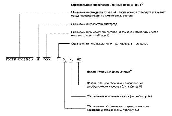 metal arc welding of creep-resisting steels. Дата введения - 2011-01-01 1 Область примененияНастоящий стандарт определяет требования к классификации покрытых электродов, основанной на испытаниях термически обработанного металла шва, для ручной дуговой сварки ферритных и мартенситных жаропрочных и низколегированных сталей, работающих при повышенной температуре. Настоящий стандарт содержит технические требования для классификации, использующей методы, основанные на химическом составе металла шва с требованиями по пределу текучести металла шва и средней энергии удара 47 Дж (метод А) и по пределу прочности при растяжении и химическому составу металла шва (метод В). Примечания 1 Разделы, подразделы и таблицы, номера которых заканчиваются буквой «А», применимы только для электродов, классифицированных по химическому составу с требованиями по пределу текучести металла шва и средней энергии удара 47 Дж. 2 Разделы, подразделы и таблицы, номера которых заканчиваются буквой «В», применимы только для электродов, классифицированных по пределу прочности при растяжении и химическому составу металла шва. 3 Разделы, подразделы и таблицы, номера которых не имеют буквенных обозначений «А» или «В», применимы для всех покрытых электродов, которые классифицируются согласно настоящему стандарту. Для сравнения, некоторые таблицы содержат требования к электродам, классифицированным в соответствии с обоими методами. В таких таблицах электроды двух разных классификаций, имеющие близкий состав и свойства, расположены на смежных строках. В строке таблицы обязательной для одной классификации обозначение аналогичного электрода из другой классификации указано в скобках. В определенных случаях допускается изготавливать электроды, которые могут быть классифицированы по обоим методам. В этом случае электроды и (или) их упаковку можно маркировать по одному из двух или одновременно двумя методами. 2 Нормативные ссылкиВ настоящем стандарте использованы датированные и недатированные ссылки на международные стандарты. При датированных ссылках последующие редакции международных стандартов или изменения к ним действительны для настоящего стандарта только после введения изменений к настоящему стандарту или путем подготовки новой редакции настоящего стандарта. При недатированных ссылках действительно последнее издание приведенного стандарта (включая изменения). ИСО 31-0-1992 Величины и единицы измерений. Часть 1. Общие принципы* (ISO 31-0:1992 Quantities and units - Part 0: General principles*) ____________ * Отменен и заменен ИСО 80000-1. ИСО 544 Материалы сварочные. Технические условия поставки присадочных материалов. Вид продукции, размеры, допуски и маркировка (ISO 544 Welding consumables - Technical delivery conditions for welding filler materials - Type of product, dimensions, tolerances and markings) ИСО 2401 Электроды покрытые. Определение эффективности наплавки, коэффициента перехода металла и коэффициента наплавки (ISO 2401 Covered electrodes - Determination of the efficiency, metal recovery and deposition coefficient) ИСО 3690 Сварка и родственные процессы. Определение содержания водорода в металле шва при дуговой сварке ферритной стали (ISO 3690 Welding and allied processes - Determination of hydrogen content in ferritic steel arc weld metal) ИСО 6847 Материалы сварочные. Наплавка слоя металла для химического анализа (ISO 6847 Welding consumables - Deposition of a weld metal pad for chemical analysis) ИСО 6947 Швы сварные. Рабочие положения. Определение углов наклона и поворота (ISO 6947 Welds - Working positions 