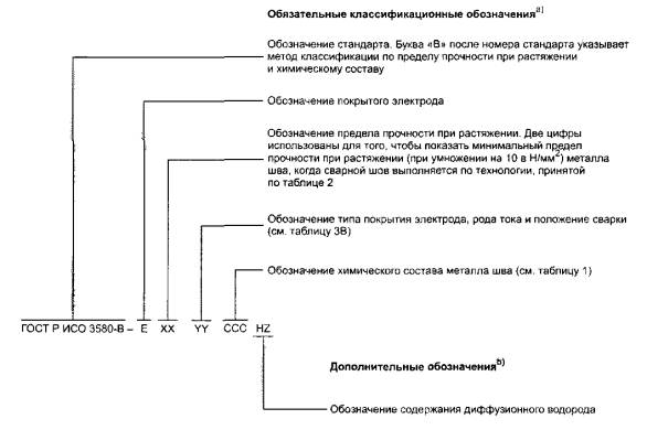 4.6В Классификация по пределу прочности при растяжении и химическому составу Нет специального символа положения сварки. Требования по положению сварки следуют из символа типа покрытия (см. таблицу 3В). 4.7 Символ содержания водорода в наплавленном металлеВ таблице 6 приведены символы содержания водорода в наплавленном металле при использовании электрода диаметром 4,0 мм, определенного методом, описанным в ИСО 3690. Используемый ток должен быть от 70 % до 90 % максимальной величины, рекомендуемой производителем. Электроды, рекомендуемые для использования на переменном токе, должны быть испытаны на переменном токе. Электроды, рекомендуемые для использования только на постоянном токе, должны быть испытаны на постоянном токе обратной полярности. Производитель должен предоставить информацию о рекомендуемом роде тока и условиях сушки для достижения допустимого уровня содержания водорода. Таблица 6 - Символ содержания водорода в наплавленном металле