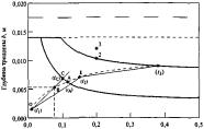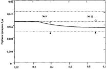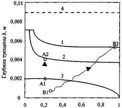 Пунктиром на рисунках показаны вспомогательные линии. Верхняя линия проведена на уровне, равном толщине стенки трубы. Средняя линия обозначает глубину несквозного дефекта, при достижении которой несквозной дефект должен быть переаттестован в сквозной дефект. Эксплуатация газопровода с дефектом такой глубины не допускается. Ордината нижней пунктирной линии равна глубине критической краевой трещины.