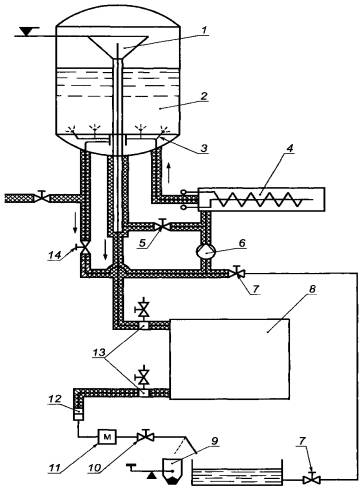 1 - перелив; 2 - бак постоянного уровня; 3 - смешивающее устройство; 4 - электрический котел; 5 - клапан; 6 - циркуляционный насос; 7 - клапан; 8 - испытуемый отопительный прибор; 9 - измерительный сосуд; 10 - клапан; 11 - теплообменник; 12 - фильтр; 13 - устройство для измерения температуры воды; 14 - клапан Рисунок 1 - Схема установки при использовании водяного метода Допускается проводить измерение расхода воды иным методом, достоверность которого подтверждена методом взвешивания, обеспечивающим погрешность измерения, не превышающую погрешность при взвешивании. 4.4.3 Электрический метод Схема установки приведена на рисунке 2. Вода с помощью насоса 6 циркулирует через электрический котел 9 и испытуемый отопительный прибор 4. Тепловой поток отопительного прибора определяют как разность подводимой электрической мощности (мощность котла плюс мощность насоса) и тепловых потерь. Тепловые потери в рабочем диапазоне температурного напора определяют с помощью короткой, хорошо изолированной перемычки, тепловые потери которой известны, устанавливаемой вместо испытуемого отопительного прибора.