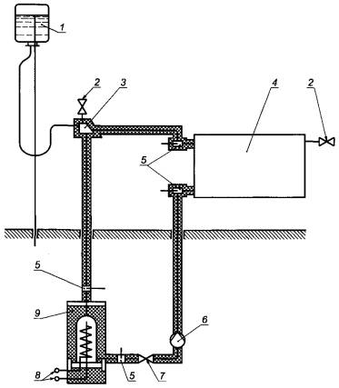 1 - расширительный бак; 2 - клапан воздухоотводчика; 3 - воздухоотделитель; 4 - испытуемый отопительный прибор; 5 - точки измерения температуры воды; 6 - насос; 7 - клапан; 8 - клеммы для присоединения к источнику напряжения; 9 - электрический котел Рисунок 2 - Схема установки при использовании электрического метода Допускается устанавливать электрический котел в испытательную камеру, если его объем не более 3 % объема камеры; при этом суммарные тепловые потери котла и подводок к испытуемому прибору не должны быть более 250 Вт при температурном напоре 70°С. 4.4.4 Схема испытательного отопительного контура и конструкция его элементов должна обеспечивать полное удаление воздуха из него. 4.4.5 Все элементы испытательного отопительного контура, за исключением испытуемого отопительного прибора, должны иметь достаточную теплоизоляцию, обеспечивающую минимальные тепловые потери. 4.4.6 Диаметр подводок должен быть равен или быть больше диаметра присоединительных отверстий (штуцеров) испытуемого отопительного прибора. 4.4.7