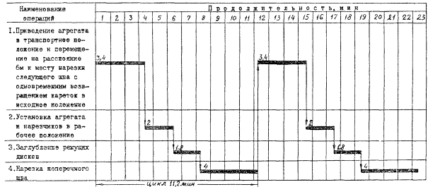 Производительность нарезчика за 1 час работы Возможная производительность за 8-часовую смену при коэффициенте использования нарезчика по времени в течение смены Кв = 0,78 составляет 250 м швов ЦИКЛОГРАММА НАРЕЗКИ ВЕРХНЕЙ ЧАСТИ ПОПЕРЕЧНЫХ ШВОВ СЖАТИЯ ПО УЗКИМ ПРОРЕЗЯМ МОДЕРНИЗИРОВАННЫМ НАРЕЗЧИКОМ Д-432АМ