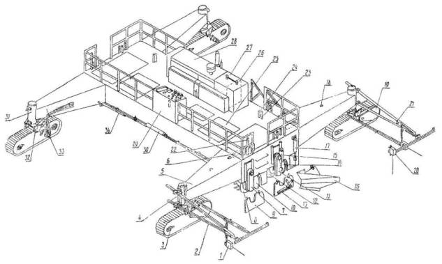 Рис. 1. Общий вид профилировщика ДС-97: 1 - датчик уровня с копиром; 2 - укосина; 3 - натяжное колесо гусеницы; 4 - гидроцилиндр подъема ноги; 5 - нога рамы; 6 - погрузочный гидроцилиндр; 7 - узел привода фрезы; 8 - фреза; 9 - дверца фрезы; 10 - отвал фрезы; 11 - узел привода шнека; 12 - шнек; 13 - заслонка; 14 - отвал шнека; 15 - гидроцилиндр заслонки; 16 - удлинитель отвала; 17 - гидроцилиндр отвала; 18 - проушина для подъема ноги; 19 - кожух привода гусеницы; 20 - датчик направления с копиром; 21 - регулировочная рукоятка датчика уровня; 22 - регулировочный винт фрезы; 23 - стопорный винт отвала шнека; 24 - механический индикатор уровня; 25 - решетка платформы; 26 - топливный бак; 27 - бак рабочей жидкости; 28 - силовая установка; 29 - пульт управления; 30 - гидроцилиндр механизма поворота; 31 - стойка ноги; 32 - вилка стойки; 33 - гидромотор привода гусеницы; 34 - тяга механизма поворота Профилировщик является универсальной автоматизированной машиной, предназначенной для профилировки земляного полотна, распределения и планировки грунтов, укрепленных вяжущими при устройстве оснований, а также для чистовой (прецизионной) профилировки этих оснований. В результате некоторого переоборудования и замены рабочих органов профилировщик может быть превращен в бетоноукладчик со скользящими формами. Двигатель мощностью 425 л.с. приводит в движение пять гидронасосов для привода гидромоторов гусениц и вращающихся рабочих органов, а также гидроцилиндров поворота гусениц, подъема главной рамы, подъема рабочих органов, погрузочных гидроцилиндров и др. Профилировщик оборудован автоматической системой выдерживания курса и стабилизации уровня. При работе на автоматическом режиме машина точно выдерживает направление и уровень, заданные копирной струной. Профилировщик имеет системы поперечной стабилизации уровня, благодаря чему он может работать при наличии только одной струны. К главной раме подвешены следующие четыре рабочих органа, состоящие из двух частей каждый: - фреза со стальными зубьями для рыхления грунта и геликоидными лопастями шнека для перемещения и распределения материалов; - отвал фрезы с грейдерными ножами для срезки и предварительной планировки материалов; - шнек, предназначенный для равномерного распределения материалов и перемещения излишков их в различных направлениях; - отвал шнека с грейдерными ножами для окончательной планировки основания. В середине отвала шнека имеется окно для переброски материалов на питатель конвейера - перегружателя или на грунтовое основание. Длина каждой половины рабочего органа составляет 4,2 м. К отвалу шнека при необходимости навешивают удлинители. Фреза и шнек приводятся в движение автономными гидромоторами (по два гидромотора на каждый рабочий орган) с регулируемым числом оборотов и реверсивом. Все рабочие органы поднимаются и опускаются гидроцилиндрами (по три гидроцилиндра на каждый рабочий орган). Фреза и отвалы для точной установки по высоте имеют установочные (регулировочные) винты. При устройстве щебеночного основания выполняют следующие работы (рис. 2): - завоз щебня, разравнивание его и планировку автогрейдером; - подкатку щебня катками; - планировку щебня профилировщиком; - уплотнение щебня катками; - обработку поверхности щебеночного слоя битумной эмульсией.