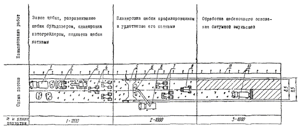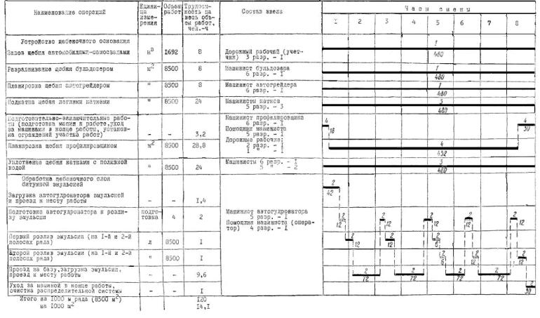 вяжущими» III. УКАЗАНИЯ ПО ОРГАНИЗАЦИИ ТРУДАДля выполнения работ по устройству щебеночного основания намечают три захватки: 1 - завоз, разравнивание, планировка и подкатка щебня; 2 - планировка щебня профилировщиком и уплотнение его катками; 3 - обработка щебеночного слоя битумной эмульсией. Как правило, работы организуют в две смены. Для работы в каждую смену организуют комплексную бригаду следующего состава: Звено по планировке и подкатке щебня Машинист бульдозера 6 разр. - 1 Машинист автогрейдера 6 » - 1 Машинисты моторных катков 5 » - 3 Дорожный рабочий 3 » - 1 Звено по планировке щебня профилировщиком Машинист профилировщика 6 разр. - 1 Помощник машиниста 5 » - 1 Дорожные рабочие: 2 » - 1 1 » - 1 Звено по уплотнению щебня катками Машинист катка на пневматических шинах 6 разр. - 1 Машинисты тяжелых вальцовых катков 5 » - 2 Звено по обработке щебеночного слоя битумной эмульсией Машинист автогудронатора 5 разр. - 1 Помощник машиниста 4 » - 1 В звене по планировке и подкатке щебня машинист бульдозера разравнивает щебень и делает грубую планировку, а машинист автогрейдера окончательно планирует щебень. Машинисты легких катков выполняют подкатку щебня. Дорожный рабочий ведет приемку и учет поступающего щебня, дает указание водителям автомобилей - самосвалов о порядке выгрузки щебня. В звене по планировке щебня профилировщиком машинист профилировщика управляет машиной и прицепным перегрузочным транспортером, а помощник машиниста, следуя за профилировщиком, контролирует толщину слоя щебня, поперечный уклон и ровность поверхности. Он также проверяет качество натяжения копирной струны. В необходимых случаях он заменяет машиниста. Дорожные рабочие в отдельных местах вручную досыпают щебень и выполняют другие вспомогательные работы. В начале смены машинист профилировщика и помощник готовят машину к работе, а в конце работы снимают датчики и сдают их в кладовую. Машину чистят, моют, смазывают ее узлы и заправляют горючим. Машинисты тяжелых катков окончательно уплотняют щебеночный слой. Машинист автогудронатора с помощником готовят машину к работе. В процессе розлива машинист управляет автогудронатором, а его помощник - распределительным агрегатом. В конце работы они очищают и промывают керосином распределительную систему. Для эффективного использования полной заправки битумной эмульсии на сменной захватке намечают участки протяженностью 400 + 400 + 200 м. После первой обработки двух первых участков обрабатывают третий двухсотметровый участок и оставшейся эмульсией (половина заправки) производят повторную обработку первого участка в начале сменной захватки на длине 200 м. Дорожные рабочие в начале смены устанавливают, а в конце работы убирают ограждение участка работ. Для повышения эффективности использования машин к началу каждого дня создают заделы (фронт работы) для каждого звена. Рекомендуется битумную эмульсию вывозить на участок работ в битумовозах ДС-10 (Д-351) емкостью 15000 л. Это повышает эффективность работы автогудронатора. Отдых рабочим в течение смены предоставляют в размере 10 % времени работы. Участок работ обеспечивают исправными машинами, материалами, инструментом, комплектом ограждения участка работ, а также передвижными вагонами: для мастера (с кладовой), столовой, душевой. Кроме того, участок работ обеспечивают передвижным туа