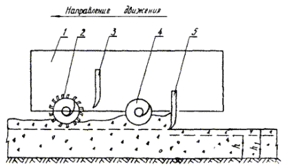 Рис. 3. Положение рабочих органов профилировщика при планировке щебня: 1 - главная рама; 2 - фреза; 3 - отвал фрезы; 4 - шнек; 5 - отвал шнека; h - толщина щебеночного слоя в плотном состоянии; h1 - толщина щебеночного слоя в рыхлом состоянии В процессе планировки поддерживают оптимально необходимое количество щебня перед отвалом для выравнивания поверхности щебеночного слоя. Уплотнение щебня катками После планировки профилировщиком верхняя часть щебеночного слоя остается разрыхленной. Поэтому уплотняют щебень сначала тяжелыми вальцовыми катками типа ДУ-18 (Д-553) за 5 - 6 проходов по одному следу и на полосе шириной 8,5 м. Скорость движения катков при первых двух - трех проходах должна быть 3 км/ч, при последующих - 4 - 5 км/ч. После этого щебень укатывают катком на пневматических шинах ДУ-31 (Д-627) за 10 - 12 проходов по одному следу. Первые два - три прохода по одному следу выполняют при скорости движения катка 5 - 6 км/ч. При последующих проходах скорость повышают до 10 - 12 км/ч. Укатку начинают от краев ряда с приближением последующих проходов к середине и перекрытием следов на 30 - 50 см. - В сухую и жаркую погоду щебень поливают водой из расчета 15 - 25 л/м2. Признаком достаточного увлажнения щебня является наличие влаги на нижней стороне верхних щебенок. Укатку заканчивают после выполнения заданного количества проходов катка по одному следу. Признаками достаточного уплотнения щебня являются: отсутствие заметного следа после прохода тяжелого катка и раздавливание щебенки, подложенной под валец тяжелого катка. На основе опыта укатки щебня на первом участке уточняют необходимое число проходов катка по одному следу, а также величину добавки на уплотнение (коэффициента уплотнения щебня). При устройстве щебеночного основания на песчаном подстилающем слое происходит вдавливание щебня в песчаный слой, что приводит к увеличению толщины щебеночного слоя и перерасходу щебня. Для предотвращения этого, по согласованию с проектной организацией, повышают отметки грунтового основания на величину вдавливания щебня в песок, которую определяют при пробной укатке. Обработка щебеночного основания битумной эмульсией Обработку щебеночного слоя битумной эмульсией (если предусмотрено проектом) выполняют по способу промасливания при норме распределения эмульсии прямого типа в пересчете на битум - 1 л/м2. Обработку щебня битумной эмульсией делают с помощью автогудронатора сразу же после укатки, когда щебень еще не загрязнен вследствие движения автотранспорта. Если по щебеночному слою было открыто движение автотранспорта и щебень загрязнился, то делают очистку щебеночного слоя автощеткой за 2 - 3 прохода по одному следу. Битумную эмульсию распределяют за два приема - вначале распределяют половину общей нормы розлива, а затем после 2 - 3 ч просыхания распределяют вторую половину нормы. Для более равномерного распределения эмульсии ширину полосы распределения назначают не более 5 - 6 м. Сперва обрабатывают одну полосу, а затем смежную. Автогудронатор устанавливают на расстоянии 10 - 15 м от начала участка и готовят его к распределению эмульсии: устанавливают распределительные трубы, а также сопла, соответствующие норме розлива. Сопла устанавливают так, чтобы их прорези располагались под углом 20 - 25° к продольной оси автогудронатора и находились от поверхности щебеночного 
