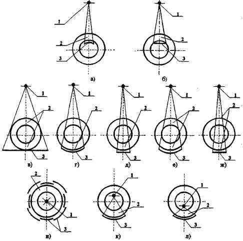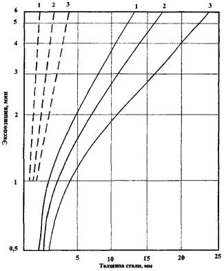 1 - источник излучения; 2 - контролируемый участок; 3 - кассета Рисунок 3 - Схема контроля сопряжений цилиндрических пустотелых изделий 6.9 Схемы контроля могут быть и отличными от приведенных на рисунках 1-3 при условии гарантированного выявления недопустимых дефектов и обеспечения необходимого контроля. 6.10 Для всех видов сварных соединений и схем просвечивания угол между направлением излучения и нормалью к пленке в центре снимка не должен превышать 45°, а расстояние между контролируемым сварным соединением и пленкой должно быть минимальным и в любом случае не превышать 150 мм. 6.19 Для уменьшения разности оптических плотностей различных участков снимков при контроле сварных соединений с большим перепадом толщин, а также если контролируемое сварное соединение не обеспечивает защиту радиографической пленки от прямого излучения, контроль сварных соединений следует проводить с применением компенсаторов. Допускается использовать компенсаторы из любого материала, обеспечивающего требуемое ослабление излучения. 6.11 Возможен в некоторых случаях контроль без компенсаторов со специальным подбором экспозиций или установлением нескольких зон контроля, перекрывающих сечение участков шва по необходимой оптической плотности участков шва, а также путем использования двух типов радиографических пленок различной чувствительности к излучению, заряженных в одну кассету. 7 ЧУВСТВИТЕЛЬНОСТЬ РАДИОГРАФИЧЕСКОГО МЕТОДА КОНТРОЛЯ7.1 Для оценки чувствительности радиографического контроля следует применять канавочные или проволочные эталоны чувствительности по ГОСТ 7512. 7.2 Абсолютная чувствительность контроля К (наименьший диаметр выявляемой на снимке проволоки проволочного эталона или наименьшая глубина выявляемой на снимке канавки канавочного эталона) определяется в миллиметрах: при использовании канавочного эталона: