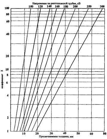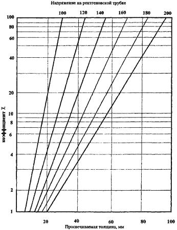 3.5 Отношение толщины контролируемого сварного соединения к общей суммарной толщине металла в направлении просвечивания должно быть не менее 0,2 для всех видов сварных соединений. 3.6 Гаммаграфический метод контроля следует осуществлять в случае невозможности или технической трудности применения рентгенографического и для контроля изделий в монтажных условиях. 3.7 Радиографический контроль проводится после исправления всех дефектов, обнаруженных при внешнем осмотре и измерении сварных швов. 4 ОБОРУДОВАНИЕ И МАТЕРИАЛЫ, ПРИМЕНЯЕМЫЕ ПРИ КОНТРОЛЕ4.1 В качестве источников излучения должны использоваться рентгеновские трубки и радионуклиды. Выбор источника рекомендуется проводить по таблице 2. 4.2 Характеристики и область применения рентгеновских аппаратов, бетатронов, линейных ускорителей, микротронов, гамма-дефектоскопов приведены в приложении А. Допускается применение аналогичной отечественной и зарубежной аппаратуры. 4.3 В качестве источников излучения при гаммаграфическом методе контроля сварных соединений применяются радиоактивные нуклиды: тулий-170, селен-75, иридий-192, цезий-137, кобальт-60. Характеристики источников приведены в приложении Б. 4.4 При проведении радиографического контроля сварных соединений должны использоваться радиографические технические пленки типа РТ. Допускается применение других типов радиографических пленок, обеспечивающих получение требуемой чувствительности контроля. Рекомендации по применению пленок приведены в приложении В. 4.5 Перед применением каждой новой партии радиографической пленки проверяется ее годность. Для этого проявляется и фиксируется как неэкспонированная так и экспонированная пленка. Параметры фотообработки должны соответствовать настоящему стандарту. Обработанная неэкспонированная пленка должна иметь равномерную оптическую плотность вуали, не превышающую значений, указанных для конца гарантийного срока по ТУ на пленку (0,15-0,20). Экспонированная пленка должна иметь равномерную плотность, без отслоений эмульсии и т.д. 4.6 Радиографические пленки могут использоваться и по истечении гарантийного срока до достижения предельных значений оптической плотности вуали и сохранения ее равномерности. 4.7 Кассеты для зарядки пленки должны обеспечивать полную светонепроницаемость и плотный прижим усиливающих экранов к пленке. Таблица 2 - Рекомендуемые источники излучения