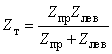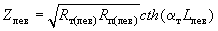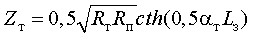 где Rт(пр) и Rт(лев) - продольное сопротивление соответственно правого и левого плеч трубопровода, Ом/м; Rп(пр) и Rп(лев) - переходное сопротивление на единицу длины МН, соответственно правого и левого плеч трубопровода, Ом×м; L(пр) и L(лев) - длина соответственно правого и левого плеч трубопровода, м. Входное сопротивление трубопровода, Zт, Ом, в этом случае определяется выражением: