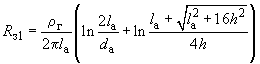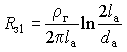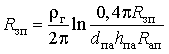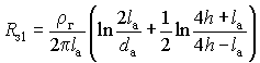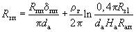 где li - длина i-го участка с удельным электрическим сопротивлением rгi, м; n - количество участков грунта по глубине скважины с удельным электрическим сопротивлением rгi. rкз - удельное электрическое сопротивление засыпки, Ом·м; rа - удельное электрическое сопротивление анодного материала, Ом·м; dа - диаметр анода, м; dз - диаметр засыпки, м; Sа - площадь сечения электрода анода, м2; 2) сопротивление растеканию анодного заземлителя в коксовой засыпке или в другом наполнителе без выхода торца на поверхность земли в коксовой засыпке или в другом наполнителе: