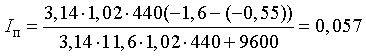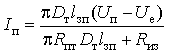 где Uп - стационарный потенциал протектора, В (таблица 8.10); Ue - естественная потенциал сооружения, В; Uтзм - минимальная защитная разность потенциалов труба-земля, В; Rиз - сопротивление изоляции трубопровода, Ом×м2; Rпт - сопротивление протектора, Ом; Dт - диаметр трубопровода, м. В формулу (8.45) подставляют значения Uп, Uтзм и Ue измеренные относительно МСЭ, а Rиз - на конечный срок службы проектируемой протекторной защиты. в) сила тока в цепи протектор-трубопровод Iп, А, равна:
