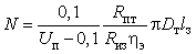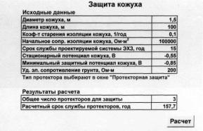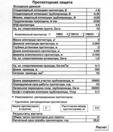 где Rиз.к - сопротивление изоляции кожуха, Ом·м2; γ - коэффициент, характеризующий изменение сопротивления изоляции во времени, 1/год; ρг - удельное электрическое сопротивление грунта, Ом·м; Dк - диаметр кожуха, м; Lк - длина кожуха, м; t - срок службы проектируемой системы ЭХЗ ; б) количество протекторов, необходимых для защиты кожуха, определяют по формуле:
