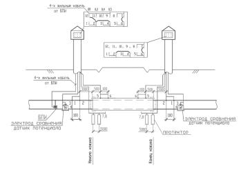 где ii - величина тока, необходимая для защиты i-го трубопровода, А; n - количество совместно защищаемых трубопроводов. 9.7 Размещение катодных станций на параллельных трубопроводах производят по минимальной длине защитной зоны на конечный период эксплуатации проектируемой совместной катодной защиты. 9.8 В точке дренажа всех параллельных трубопроводов используют электрическую перемычку с целью резервирования катодной защиты на случай отказа в работе одной из защитных установок. 9.9 Точку дренажа установки совместной катодной защиты выбирают, исходя из состояния изоляционного покрытия трубопровода: в общем случае, точку дренажа оборудуют на трубопроводе с наибольшей постоянной распространения тока (наименьшей длиной защитной зоны установки катодной защиты) или, в частном случае, на трубопроводе с худшей изоляцией (требующим большего защитного тока). 9.10 Перемычки должны размыкаться с целью контроля величины тока в перемычке и облегчения наладки электрохимической защиты. 9.11 Если трубопроводы имеют технологическую перемычку на расстоянии от точки дренажа менее 1/4 длины защитного плеча, то электрические перемычки в точках дренажа не устанавливаются. 9.12 Оптимальные схемы совместной катодной защиты параллельных трубопроводов с применением подпочвенных и глубинных АЗ: - одна катодная установка на все параллельные трубопроводы при общем токе защиты на пятнадцатый год эксплуатации не более 40 А. Анодное заземление может быть расположено по любую сторону от трубопроводов; - две катодных установки на параллельных трубопроводах при общем токе защиты на пятнадцатый год эксплуатации не более 60 А. Анодные заземления катодных установок могут быть расположены как по одну сторону от трубопроводов, так и по разные стороны. При размещении анодных заземлений по одну сторону от трубопроводов расстояние между ними должно быть не менее 3 их линейных размеров, но не менее 200 м; - при токе защиты каждого трубопровода более 25 А катодные установки должны быть оборудованы на каждом трубопроводе, а точки дренажа соединяют перемычками; - при расстоянии между параллельными трубопроводами более 50 м независимо от силы защитного тока целесообразна установка катодных станций на каждом трубопроводе. 9.13 Включение нескольких катодных станций с разными точками дренажа на одно анодное заземление не допускается. 9.14 В случаях, когда напряжения катодной станции недостаточно для обеспечения необходимого защитного тока допускается последовательное соединение двух катодных станций (преобразователей). 9.15 Электрические перемычки должны выполняться только с применением контрольно-измерительных пунктов, клеммы контрольной панели и проводники должны быть рассчитаны на величину защитного тока. 9.16 Электрические перемычки между трубопроводами должны быть установлены только в точках дренажа. 9.17 Для снятия вредного влияния ЭХЗ на посторонние сооружения (трубопроводы, кабели связи и др.) должна быть установлена электрическая перемычка с резисторным блоком (кроме тех случаев, когда это влияние снимают протекторной установкой). 9.18 Подключение перемычек между трубопроводом и кабелем связи должно выполняться в местах расположения соединительных муфт на кабелях связи. 10 ПРОЕКТИРОВАНИЕ ЭХЗ УЗЛОВ ЗАДВИЖЕК И КАМЕР ПРИЕМА-ПУСКА ДИАГНОСТИЧЕСКИХ СНАРЯДОВ10.1 Про