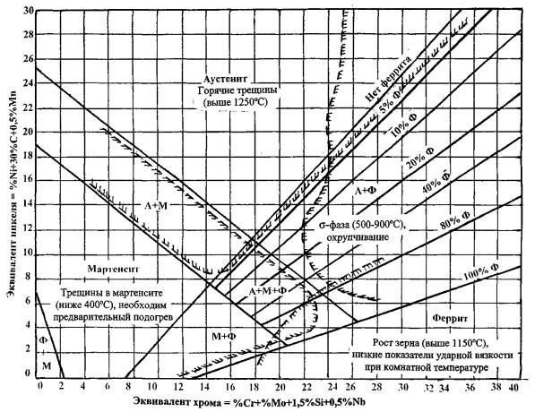 Рисунок 5.1 - Диаграмма Шеффлера 5.10 Термообработка разнородных сварных соединений, включающих неаустенитные материалы и выполняемых аустенитными сварочными материалами, не допускается. В исключительных случаях термообработка производится по указанию в техническом проекте. Термообработка разнородных сварных соединений, выполняемых неаустенитными сварочными материалами, производится по режимам более легированных сталей. 5.11 В сварных соединениях сталей, имеющих разные коэффициенты линейного расширения и работающие при температурах выше 400°С, возникают термические напряжения, которые могут оказать отрицательное влияние на прочность соединения. В связи с этим для ответственных сварных узлов, работающих в условиях циклического нагружения требуется проведение специального расчета. Работоспособность сварных соединений сталей разных структурных классов должна оцениваться с учетом суммарного действия рабочих, остаточных и температурных напряжений, а также циклических нагрузок. 6. Требования к выполнению сварных соединений6.1 Сварные конструкции должны проектироваться с учетом рационального применения сочетаний разнородных сталей и выполнения максимального объема сварочных работ на заводе-изготовителе. 6.2 При проектировании ответственных (нагруженных) конструкций из разнородных сталей разных структурных классов рекомендуется: - предпочитать стыковые соединения другим видам: угловым, тавровым, нахлесточным. Расположение швов должно обеспечивать удобство сварки, надежность ее выполнения; - располагать разнородное соединение в наименее нагруженных областях конструкции и в зонах пониженных температур эксплуатации; - максимально возможно исключить в области разнородных швов концентраторы напряжений; - предусмотреть эффективный контроль на отсутствие внешних и внутренних недопустимых дефектов; - принимать конструктивные и другие решения, исключающие необходимость термической обработки; - исключать термообработку разнородных сварных соединений, включающих теплоустойчивые или высокохромистые нержавеющие стали, а также углеродистые и низколегированные стали толщиной свыше 30 мм, выполняемых аустенитными сварочными материалами; - для повышенных температур и сложных условий эксплуатации в соединение вводить промежуточные конструктивные элементы из более стабильных сталей или наплавок, с целью ограничения развития хрупких прослоек. 6.3 При разработке технологического процесса сварки разнородных сталей необходимо учитывать: - технологические особенности (свариваемость) сталей и сплавов, специальные требования (подогрев, термообработка и т.п.), которые принимаются для разнородного соединения по действующей нормативно-технической документации на сварку обеих сталей, составляющих разнородное соединение; - возможность образования дефектов, особенно холодных и горячих трещин, специфических для каждой из свариваемой стали; - возможность образования и развития структурных неоднородностей (диффузионных и кристаллизационных прослоек); - необходимость и достаточность обеспечения механических свойств и коррозионной стойкости сварных соединений. 6.4 Максимальная температура эксплуатации разнородных сварных соединений сталей аустенитного класса с углеродистыми и низколегированными марганцевокремнист
