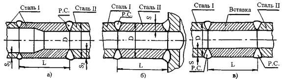 а - стыки труб с разной толщиной стенки; б - расположение стыка труб разнородных сталей (Р. С.) вблизи жесткого закрепления; в - вставка из стали промежуточного состава Рисунок 6.1 - Вставки в трубопроводах из разнородных сталей Длина вставки L определяется допускаемым расстоянием между сварными швами в соответствии с требованиями ПБ 03-576 и ПБ 03-585. 6.25 Режимы сварки, предварительного и сопутствующего подогрева, а также термической обработки должны применяться с учетом свариваемости менее технологичной стали, входящей в данное соединение, приведены в ОСТ 26.260.3, ОСТ 26.260.480, СТО 00220368-008, РТМ 26-44. Характеристики свариваемости различных групп сталей и технологические требования к ним приведены в таблице 6.2. Таблица 6.2 - Характеристики свариваемости различных групп сталей и технологические требования к ним