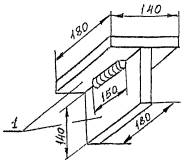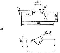 а - образец для испытаний по ГОСТ 26389; б - подготовка канавки под заварку на корпусе аппарата при положительных результатах испытаний на горячие трещины по ГОСТ 26389 Рисунок 14.2 - Тип образца для качественной оценки склонности к горячим трещинам по ГОСТ 26389 применительно к корпусам аппаратов Такой тип образца позволяет при отсутствии возможности специальной вырезки образца из действующего корпуса аппарата выполнить канавку для наплавки контрольного шва непосредственно на внутреннюю поверхность корпуса аппарата. При этой методике в случае отсутствия склонности к горячим трещинам контрольный шов вышлифовывается полностью с обеспечением переходного радиуса не менее 5 мм в донной части выборки и в переходных участках к поверхности корпуса (рисунок 14.2 б), а образовавшаяся поверхность выборки контролируется цветной дефектоскопией в объеме 100 %. После этого выборка заплавляется предназначенными для данной стали электродом. После сошлифовки усиления кольцевого шва заподлицо с поверхностью корпуса аппарата выполняется контроль зоны наплавки и околошовной зоны цветной дефектоскопией. 14.7 Конструкция плоских и трубных образцов для качественной оценки склонности к холодным трещинам может быть принята по типу VII ГОСТ 26388 (рисунок 14.3).