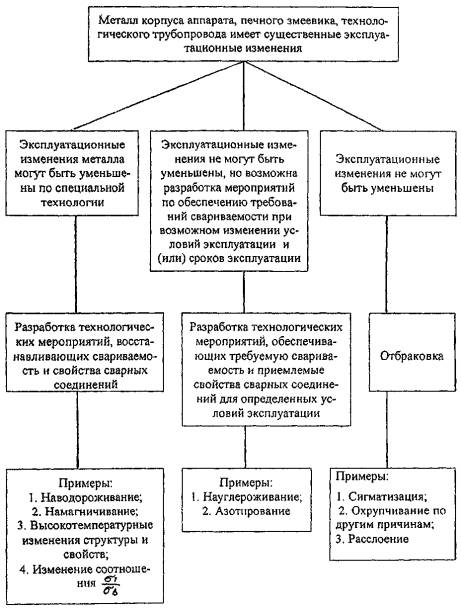 I - внутренняя поверхность корпуса аппарата (б) и трубопровода (в); II - наружная поверхность корпуса аппарата (б) и трубопровода (в); 1, 2, 3, 4 - последовательность выполнения швов Рисунок 14.3 - Образцы для испытания на холодные трещины по типу VII ГОСТ 26388 14.8 Оценка влияния эксплуатационных изменений металла на стойкость против холодных трещин при сварке осуществляется при испытании образцов типа 9 б ГОСТ 26388 путем оценки стойкости к трещинам последнего валика 4, выполняемого в наиболее жестких условиях (после предварительной сварки остальных трех швов крестового образца, рисунок 14.3). При таких испытаниях при необходимости можно сравнить трещиностойкость внутренней и наружной поверхностей корпуса аппарата и трубопровода. 14.9 Уточнение характера, природы и степени эксплуатационного изменения металла, отрицательно влияющего на свариваемость и свойства получаемых сварных соединений, возможно только при комплексной оценке по специальным методикам специалистами различного технического профиля, поэтому такую оценку выполняет специализированная научно-исследовательская организация по эксплуатации и ремонту нефтехимоборудования ОАО «ВНИКТИнефтехимоборудование». 14.10 ОАО «ВНИКТИнефтехимоборудование» рассматривает отклонения свариваемости и (или) свойств сварных соединений от нормативных требований, при необходимости с привлечением неразрушающих методов контроля по специальным методикам выполняет уточнения и делает одно из возможных заключений, приведенных на рис. 14.4.