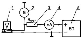 где δВПТ - границы погрешности вольтметра переменного тока, %. 10.6.4 Границы основной относительной погрешности виброметра, рассчитанные по формуле (27) или (28), не должны превышать значений, указанных в паспорте виброметра. 10.7 Проверка встроенных фильтров10.7.1 Проверку фильтров проводят для виброметров, имеющих отключаемые встроенные в измерительный прибор полосовые фильтры (в том числе, октавные, третьоктавные). Проверку выполняют при включенных полосовых фильтрах. Проверяемые параметры фильтров и порядок их определения приведены в приложении Б. 10.8 Определение электрической емкости пьезоэлектрического вибропреобразователя10.8.1 Электрическую ёмкость пьезоэлектрических вибропреобразователей определяют при отсутствии в их составе встроенных электронных устройств. Если пьезоэлектрический вибропреобразователь имеет неразъемное соединение с кабелем, то определяют емкость вибропреобразователя вместе с неразъемным кабелем. В этом случае емкостью вибропреобразователя считают его суммарную емкость с неразъемным кабелем. 10.8.2 Для определения электрической емкости пьезоэлектрического вибропреобразователя его подключают соединительным кабелем к входу низкочастотного измерительного моста переменного тока. Измеряют электрическую емкость вибропреобразователя с кабелем. Затем отсоединяют кабель от вибропреобразователя и определяют емкость кабеля. Емкость вибропреобразователя есть разность между результатами первого и второго измерений. 10.8.3 Значение емкости вибропреобразователя должно соответствовать значению, указанному в паспорте на вибропреобразователь. 10.9 Проверка внутреннего сопротивления индукционного и вихретокового вибропреобразователей10.9.1 К контактам разъема, соединенным с сигнальной катушкой индукционного и вихретокового вибропреобразователей, подключают омметр и измеряют внутреннее сопротивление сигнальной катушки. 10.9.2 Значение сопротивления сигнальной катушки должно соответствовать значению, указанному в паспорте на вибропреобразователь. 10.10 Определение начального рабочего напряжения (тока) для вибропреобразователей с выходом по напряжению (току)10.10.1 Начальное рабочее напряжение (ток) вибропреобразователей с выходом по напряжению (току) определяют при отсутствии в комплекте усилителя-возбудителя, с выхода которого снимают напряжение, пропорциональное измеряемому параметру физической величины на входе вибропреобразователя (например, драйвера или адаптера). 10.10.2 Для определения начального рабочего напряжения (тока) подключают вибропреобразователь с выходом по напряжению (току) к источнику питания в соответствии с требованиями руководства по эксплуатации. Обобщенная схема подключения вибропреобразователя с выходом по напряжению (току) представлена на рисунке 1. К токовому выходу подключают нагрузочный резистор Rнагр, миллиамперметр мА, а к выходу по напряжению - вольтметр В. Значение электрического сопротивления нагрузочного резистора должно соответствовать паспортным данным (руководства по эксплуатации).