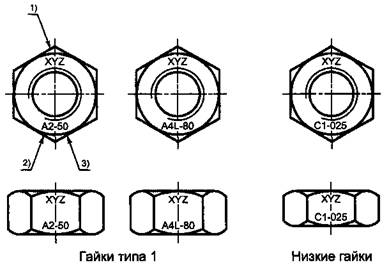 1) Знак изготовителя. 2) Марка стали. 3) Класс прочности. Маркировка с обозначением материала и товарного знака изготовителя