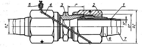 10 - законцовка трубопровода деформированная, исполнение 3 с переходным ниппелем 11; 12 - гайка переходная * Размеры для справок. Рисунок 3 - Схема соединения с переходным ниппелем исполнения 3 3.1.2.3 По усмотрению разработчика изделия допускается отсутствие трубчатых пломб (см. рисунок 1, позиция 5). 3.1.2.4 Наружные диаметры, толщины стенок труб, габаритные и присоединительные размеры должны соответствовать указанным в таблице 1. Таблица 1 В миллиметрах