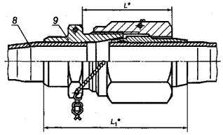 8 - законцовка трубопроводов деформированная, исполнение 2 с проходным штуцером 9 * Размеры для справок. Рисунок 2 - Схема соединения без соединительной арматуры Исполнение 3 Остальное - см. рисунки 1 и 2