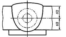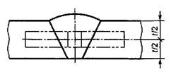 Рисунок 3 - Расположение образца с надрезом для испытаний на ударный изгиб в контрольном соединении Образцы для испытаний на растяжение должны соответствовать ИСО 5178. Диаметр рабочей зоны образца должен быть 10 мм, за исключением контрольных соединений типа 1.0 и 1.1, для которых диаметр рабочей зоны должен быть 8 мм. Образцы для испытаний на ударный изгиб должны соответствовать ИСО 9016:2000. Образец для испытаний на ударный изгиб необходимо располагать по средней линии толщины пластины. Размер образцов для испытаний на ударный изгиб должен быть 10×10 мм. 9 Повторные испытанияЕсли по какому-либо испытанию получены неудовлетворительные результаты, необходимо выполнить повторные испытания в соответствии с действующими требованиями. 10 Отчет по испытаниямВ отчете должны быть указаны следующие данные: a) контрольное соединение и сварочные материалы: - тип контрольного соединения и однозначная идентификация; - материал пластин для испытаний; - материал подкладки; - стандартное обозначение и торговая марка сварочных материалов и количество наплавленных на кромки слоев (если необходимо); - режимы повторной прокалки сварочных материалов; - номер плавки или номер партии сварочных материалов; - диаметр сварочных материалов; b) применяемые параметры сварки: - способ сварки; - положение при сварке; - источник питания; - тип тока и полярность; - ток [и(или) скорость подачи проволоки], напряжение и скорость перемещения; - расстояние от мундштука до поверхности пластины (вылет электрода); - тип и расход защитного газа; - количество проходов/количество слоев; - валик, наплавленный без поперечных колебаний электрода, или валик, наплавленный с поперечными колебаниями электрода; - температура предварительного подогрева; - температура металла шва перед наложением последующего слоя (между проходами); c) термическая обработка (включая обработку для удаления водорода): - температура; - время выдержки; - условия охлаждения; d) отклонения от настоящего стандарта; e) результаты испытаний: - температура испытаний; - рентгенографический контроль, если необходимо; - предел текучести, предел прочности на разрыв, относительное удлинение; - ударная вязкость; - дефекты. Приложение