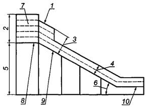 1 - первый метр участка скольжения; 2 - высота ограждающей стены стартового участка; 3 - высота ограждающей стены, равная росту посетителя; 4 - высота ограждающей стены, равная 50% роста посетителя; 5 - высота свободного падения; 6 - угол склона более 30°; 7 - ограждающая стена стартового участка; 8 - поверхность стартового участка; 9 - участок скольжения; 10 - конечный участок Рисунок 4 - Высота ограждающих стен на склонах 4.2.10 Конечный участок горки 4.2.10.1 Все горки должны иметь конечный участок со средним углом наклона не более 10°. 4.2.10.2 Длину конечного участка следует определять с учетом высоты стартового участка горки и измерять от конца радиуса или угла участка скольжения до края надувной конструкции. Минимальная длина конечного участка горки приведена в таблице 1. Таблица 1 - Минимальная длина конечного участка горки В сантиметрах
