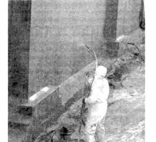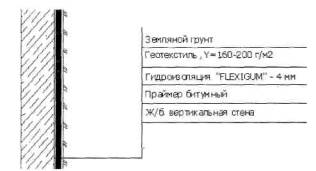 Рис. 4. Конструктивное решение гидроизоляции стен подземных сооружений Технология устройства гидроизоляцииВ состав битумно-латексной эмульсии «FLEXIGUM» входит вода, поэтому при транспортировке и хранении на складе эмульсия не должна подвергаться воздействию отрицательных температур. Рекомендуемая температура хранения от +5°С до +40°С. Эмульсия поставляется производителем в металлических бочках емкостью 200 л. Работы по устройству гидроизоляции выполняются при температуре воздуха не ниже +5°С. При температуре ниже +5°С место работы следует ограждать и применять калориферы. Особенностью устройства гидроизоляции из битумно-латексной эмульсии является ее высокая адгезия к основанию, поэтому не требуется выравнивать основание под гидроизоляцию цементно-песчаным раствором. Лучший эффект достигается при нанесении гидроизоляции на основную ограждающую конструкцию, так как большинство выравнивающих стяжек в процессе эксплуатации отрываются от основных конструкций с нарушением целостности гидроизоляционного слоя. Бетонную поверхность, на которую наносится гидроизоляция, нужно очистить от строительного мусора, грязи и пыли сжатым воздухом от компрессора или промышленным пылесосом. Поверхность не должна иметь острых неровностей, остатков смазки от опалубки, отслоений. Все швы должны быть заполнены цементным раствором. Поверхность должна быть прочной и сухой не менее 48 часов до начала устройства гидроизоляции (влажность бетона не более 15%). Перед устройством гидроизоляции на поверхность наносится битумная грунтовка с расходом 0,45 кг/м2. Грунтовка может наноситься распылением с помощью установки безвоздушного напыления. В случае производственной необходимости для грунтования можно использовать компрессор производительностью не менее 5 м3/мин., который создает давление 0,5÷0,8 МПа. Установка безвоздушного напыления битумно-латексной эмульсии состоит из двигателя внутреннего сгорания мощностью 9 кВт, двух насосов, двух гибких шлангов высокого давления на съемных катушках и пистолета-распылителя. Установка весит 250 кг, что придает ей мобильность. Промывка шлангов и пистолета-распылителя осуществляется керосином или дизельным топливом. Эмульсия и коагулянт подаются к месту работ в емкостях. Водный раствор коагулянта (хлористый кальций) - в соотношении 6:1. Соотношение битумно-латексной эмульсии «FLEXIGUM» к раствору коагулянта - 8:1. Звено рабочих состоит из трех человек, один из которых наносит гидроизоляционный материал, второй помогает переносить шлаги по фронту работ, третий - следит за работой установки. Распыление гидроизоляционного материала следует начинать с места, наиболее удаленного от установки и продвигаться по направлению к ней. В процессе работы шланги нужно переносить так, чтобы не повредить нанесенную гидроизоляционную мембрану. Для обеспечения отвода и быстрого высыхания выделяющейся в виде отдельных капель диаметром 0,1÷0,5 мм технологической влаги, распыление нужно начинать с наиболее низкого участка и двигаться к более высокому. На вертикальных поверхностях начинать распыление гидроизоляционного состава необходимо снизу вверх. При устройстве гидроизоляции следует сохранять расстояние от сопла распылителя до изолируемой поверхности не менее 600 мм. Передвигать распылитель со скоростью 20÷25 м/мин. Изо