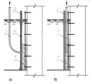 Как следует из приведенных таблиц с результатами испытаний, данные материалы при температуре -20°С уже через 2 часа набирают прочность, достаточную для работы сооружения в обычном режиме. Кроме этого, даже при проведении работ в зимнее время данные материалы не требуют устройства «тепляка» и обладают такими сроками твердения, которые позволяют значительно сократить период производства работ, уменьшив таким образом трудозатраты и поучив существенный экономический эффект. Ремонт железобетонных конструкций гидротехнических сооружений, в зависимости от их расположения, вида и размера разрушения, производится различными способами. К ним относятся: - локальный ремонт ручным способом в надводной зоне - локальный ремонт ручным способом в подводной зоне (с помощью водолазов) - подводное механизированное бетонирование - ремонт с применением кессонов и плавсредств - капитальный ремонт с применением различной техники. От выбранного способа ремонта зависит и выбор применяемых материалов. Допустим, при выполнении локального ремонта небольших повреждений на малых глубинах, в том числе в условиях водного потока, применяются материалы, твердеющие под водой в течение 5 минут (PCI POLYFIX 5 min). При подводном механизированном бетонировании применяются специальные литые составы для заливки в опалубку. Существуют две схемы заливки методом вытеснения воды из опалубки: а) по гибкому шлангу через втулки в опалубке б) по трубопроводу, нижний конец которого опущен в бетонную массу.