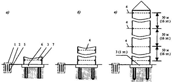 а - на стадии возведения фундамента; б - на стадии возведения здания; в - в построенном здании; 1 - исходная высотная основа; 2 - привязочный ход; 3 - деформационная сеть; 4 - деформационная сеть на монтажном горизонте; 5 - глубинный репер; 6 - осадочная марка в полу; 7 - осадочная марка на колонне