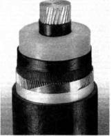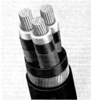 Рис. 2. Трехжильный кабель СПЭ 4. Особенности монтажа силовых кабелей с изоляцией из сшитого полиэтилена1) Прокладка кабелей с изоляцией из сшитого полиэтилена рекомендуется при температуре окружающей среды не ниже 0 °С. Допускается прокладывать кабели с изоляцией СПЭ без подогрева при температуре окружающей среды не ниже -15 °С для кабелей с оболочкой из ПВХ и пластиката -20 °С для кабелей с оболочкой из полиэтилена. При более низких температурах окружающей среды кабель должен быть нагрет выдержкой в обогреваемом помещении не менее 48 ч или при помощи специального устройства до температуры не ниже 0 °С, при этом прокладка должна производиться в сжатые сроки (не более 30 минут). После прокладки кабель должен быть немедленно засыпан первым слоем грунта. Окончательную засыпку и уплотнение грунта производят после охлаждения кабеля. Прокладка кабелей при температуре окружающей среды ниже - 40 °С не допускается. 2) Минимальный радиус изгиба кабелей с изоляцией из сшитого полиэтилена при прокладке должен быть не менее 15Dн для одножильных и трехжильных кабелей и 12 Dh для трех скрученных вместе одножильных кабелей, где Dh - наружный диаметр кабеля или диаметр по скрутке для трех скрученных вместе одножильных кабелей. При тщательном контроле изгиба, например, применением соответствующего шаблона, допускается уменьшение радиуса изгиба кабеля до 8Dh. При этом рекомендуется подогрев кабеля в месте изгиба до температуры 20 °С. 3) Размотка кабеля с изоляцией из сшитого полиэтилена с барабана должна производиться при применении необходимого количества проходных и угловых роликов. Применяемый метод размотки должен обеспечивать целостность кабеля. Во время прокладки тяжение кабелей СПЭ должно осуществляться при помощи натяжного стального чулка, наложенного на наружную оболочку, или за токопроводящую жилу при помощи клинового захвата. Усилия, возникающие во время тяжения кабеля с изоляцией из сшитого полиэтилена с многопроволочной алюминиевой жилой, не должны превышать 30 Н/мм2 номинального сечения жилы, кабеля с однопроволочной алюминиевой жилой (с маркировкой «ож») - 25 Н/мм2, кабеля с медной жилой - 50 Н/мм2. Если одновременно прокладываются три одножильных кабеля с одним общим стальным чулком, при расчете усилия тяжения учитывают: - 1 номинальных сечения жилы, если кабели скручены вместе; - 2 номинальных сечения жилы, если кабели не скручены. Усилия тяжения кабеля при прокладке должны быть рассчитаны при проектировании кабельной линии и учтены при заказе кабеля. Тяговая лебедка должна быть оборудована устройствами, позволяющими контролировать усилие тяжения кабеля, регистрировать усилие тяжения в течение всего процесса тяжения кабеля и автоматически отключать тяговую лебедку, если усилие тяжения превысит допустимую величину. 4) Кабели с изоляцией из сшитого полиэтилена СПЭ следует укладывать с запасом по длине 1¸2 %. В траншеях и на сплошных поверхностях внутри зданий и сооружений запас создается путем укладки кабеля «змейкой», а по кабельным конструкциям (кронштейнам) этот запас создается образованием стрелы провеса. Укладывать кабель в виде колец (витков) не допускается. 5) Металлические кабельные конструкции должны быть заземлены в соответствии с действующей документацией. 6) При прокладке кабельной линии кабели СПЭ трех фаз должны про