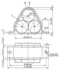 Рис. 4. Крепление трех кабелей в связке (в треугольник) Обозначения: 1- кабель; 2- хомут (скоба) из алюминия или алюминиевого сплава толщиной 5 мм; 3 - прокладка из резины или поливинилхлорида толщиной 3¸5 мм.