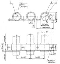 Рис. 5. Крепление трех кабелей Обозначения: 1- кабель; 2- хомут (скоба) из алюминия или алюминиевого сплава; 3- прокладка из резины или поливинилхлорида. 6. Технология прокладки кабеляПрокладку кабеля осуществляет бригада в количестве 5-7 человек. Примерная схема расстановки рабочих при протяжке кабеля: - барабан, на тормозе - 1 человек; - сход кабеля с барабана - 1 человек; - спуск кабеля в траншею (вход, выход из туннеля) - 1 человек; - на лебедке - 2 человека; - сопровождение конца кабеля - 2 человека. Кроме того, необходимо предусмотреть по одному человеку: - на каждом углу поворота; - на каждом проходе в трубах через перегородки или перекрытия, у входа в камеру или здание. При одновременном тяжении трех кабелей за устройством для группирования кабелей должны находиться 2 человека для скрепления кабеля в треугольник. Скорость прокладки не должна превышать 30 м/мин и должна выбираться в зависимости от характера трассы, погодных условий и усилий тяжения. При превышении допустимой величины усилия тяжения необходимо остановить прокладку и проверить правильность установки и исправность линейных и угловых роликов, наличие смазки (воды) в трубах, а также проверить кабель на возможное заклинивание в трубах. Дальнейшая протяжка кабеля возможна только после устранения причин превышения допустимых усилий тяжения. При спуске кабеля в траншею или входе в туннель необходимо следить, чтобы кабель не соскальзывал с роликов и не терся о трубы и стенки в проходах. На входе в трубы необходимо следить за тем, чтобы не повреждались защитные покровы кабелей о край трубы. При повреждении оболочки кабеля необходимо остановить прокладку, осмотреть место повреждения и принять решение о способе ремонта оболочки. Сопровождающие конец кабеля должны следить за тем, чтобы кабель шел по роликам, при необходимости подправляют ролики, а также направляют конец кабеля. Кабель вытягивается таким образом, чтобы при укладке его по проекту расстояние от верха концевой муфты или от условного центра соединительной муфты было не менее 2 м. При определении запаса следует учитывать, что остатка кабеля на барабане должно хватить для монтажа муфты. Отсоединить тяговый трос и снять чулок или захват с конца кабеля. В случае, если на барабане находится кабель для нескольких участков трассы, или если длина кабеля существенно больше длины участка, необходимо обрезать кабель. После обрезки кабеля необходимо герметизировать концы кабелей капированием. Для более надежной герметизации концов кабелей возможно применить двойное капирование. Внутреннюю капу осадить на электропроводящий слой по изоляции кабеля, а наружную капу - на внутреннюю капу и на оболочку кабеля. Возможно, также перед капированием нанести на обрез кабеля слой расплавленного битума. При необходимости концы кабеля завести в камеры, колодцы, кабельные помещения. При этом необходимо соблюдать допустимые радиусы изгиба кабеля. Снять кабель с роликов, уложить и закрепить его по проекту. При прокладке в траншее произвести присыпку кабеля песчано-гравийной смесью или мелким грунтом толщиной не менее 100 мм и провести испытания оболочки кабеля. Журнал «Ценообразование и сметное нормирование в строительстве», ноябрь 2010 г. № 11