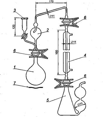 1 - колба для дистилляции; 2 - каплеотбойная головка; 3 - капельная цилиндрическая воронка; 4 - холодильник; 5 - коническая колба с боковыми шарообразными расширениями; 6 - пружинные зажимы; 7 - электроплитка или колбонагреватель Рисунок 1 - Установка для отгонки аммиака В состав установки входят: - колба для дистилляции вместимостью 1000 см3 с внутренним шлифом или колба К-1-1000-29/32 ТХС по ГОСТ 25336, или колба Къельдаля 2-500-29 ТХС по ГОСТ 25336; - головка каплеотбойная с внешним шлифом и параллельными входом и выходом или каплеуловитель КО-14/23-60 по ГОСТ 25336; - воронка капельная ВК-50 по ГОСТ 25336; - холодильник с прямой трубкой длиной не менее 400 мм, имеющий внутренний шлиф на входе и внешний шлиф на выходе, или холодильник ХПТ-1-400-14/23ХС по ГОСТ 25336; - колба коническая вместимостью 500 см3 с внутренним шлифом, снабженная двумя боковыми шарообразными расширениями; - зажимы пружинные; - плитка электрическая или колбонагреватель по ГОСТ 14919. Весы лабораторные по ГОСТ 24104 любого типа, класс точности высокий, дискретность - не более 0,1 мг, наибольший предел взвешивания (НПВ) - не менее 50 г, наименьший предел взвешивания (НмПВ) - не более 10 мг. Бюретка 1-(1-5)-2-50-0,1 по ГОСТ 29251. Цилиндры 1(3)-50-2; 1(3)-100-2; 1(3)-500-2 по ГОСТ 1770. Колбы 1 (2)-100-2 и 1 (2)-500-2 по ГОСТ 1770. Пипетка 2-2-50 по ГОСТ 29169. Капельница по ГОСТ 25336. Воронка В-36-80 ХС по ГОСТ 25336 или полая грушевидная стеклянная пробка. Средства против бурного кипения «кипелки» - стеклянные шарики диаметром 3-5 мм или кусочки пористого материала, устойчивого в данной среде (пемза, триоксид алюминия). Вода дистиллированная по ГОСТ 6709 или вода эквивалентной чистоты. Медь (II) сернокислая 5-водная по ГОСТ 4165. Кислота серная по ГОСТ 4204 концентрированная и раствор молярной концентрации с (1/2H2SО4) = 0,5 моль/дм3, готовят по ГОСТ 25794.1. Спирт этиловый ректификованный технический по ГОСТ 18300. Натрия гидроокись по ГОСТ 4328, раствор с массовой концентрацией 450 г/дм3 и раствор молярной концентрации с (NaOH) = 0,5 моль/дм3, готовят по ГОСТ 25794.1. Метиловый красный (индикатор), спиртовой раствор с массовой долей 0,2 %. Метиленовый голубой (индикатор), спиртовой раствор с массовой долей 0,1 %. Бромкрезоловый зеленый (индикатор), водно-спиртовой раствор с массовой долей 0,1 %, готовят по ГОСТ 4919.1. Индикатор смешанный с рН 5,1, готовят по ГОСТ 4919.1 смешением спиртового раствора метилового красного и водно-спиртового раствора бромкрезолового зеленого. Допускается использовать смешанный индикатор с рН 5,4, приготовленный по ГОСТ 4919.1 смешением спиртовых растворов метилового красного и метиленового голубого. 7.4.2.3 Проведение анализа Взвешивают 5 г карбамида (результат взвешивания в граммах записывают с точностью до четвертого десятичного знака) и переносят в колбу Къельдаля или круглодонную колбу. В колбу Къельдаля, содержащую пробу карбамида, добавляют 25 см3 воды, 50 см3 концентрированной серной кислоты и (0,75 ± 0,05) г сернокислой меди (результат взвешивания в граммах записывают с точностью до второго десятичного знака). Закрывают колбу Къельдаля грушевидной пробкой или воронкой и медленно нагревают до полного удаления диоксида углерода. Нагревание продолжают до выделения белых паров и нагревают еще в течение 20 мин. Затем охлаждают и осторожно добавляют 300 см3 воды, вновь охлаждают до комнатной температуры и перемешивают содержимое колбы. Количественно переносят содержимое в мерную колбу вместимостью 