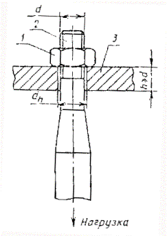 В случае применения болтовых соединений с мелким шагом резьбы рекомендуется для гаек следующий по величине класс прочности по сравнению с классом прочности болтов с крупным шагом резьбы: Пример: гайки класса прочности 10 - болты класса прочности 8.8. 4. МЕТОДЫ ИСПЫТАНИЙ4.1. Испытание пробной нагрузкой Испытание пробной нагрузкой должно проводиться в тех случаях, когда это позволяет применяемое испытательное оборудование, и это испытание является решающим для гаек диаметром > M5. Гайка 1 навинчивается на закаленную оправку 2 как указано на чертеже. Решающим является испытание на растяжение по оси (чертеж A). А)