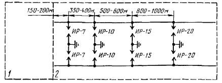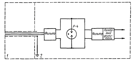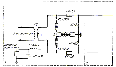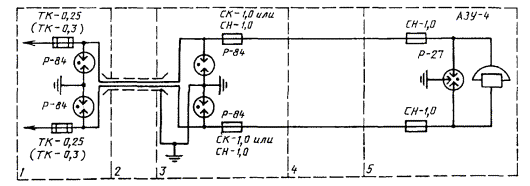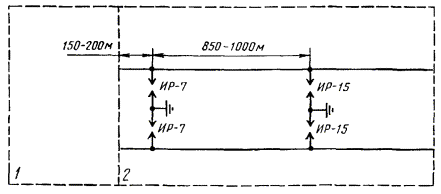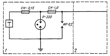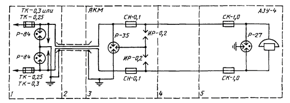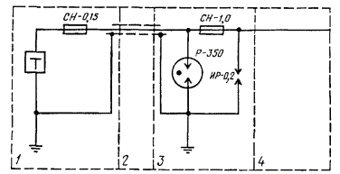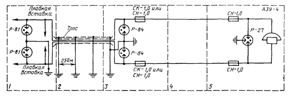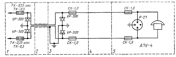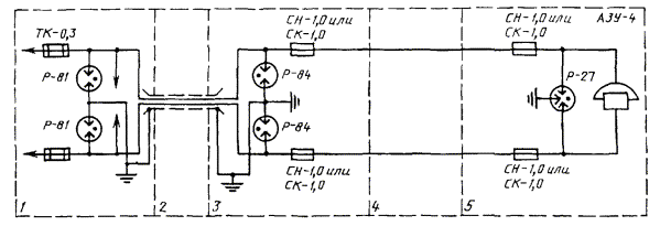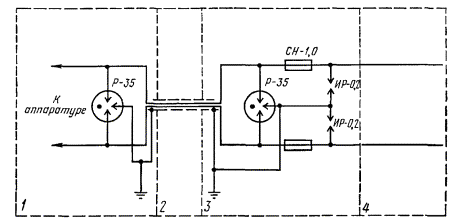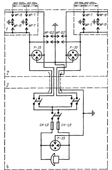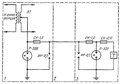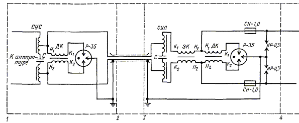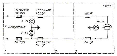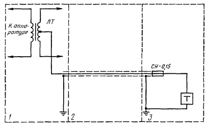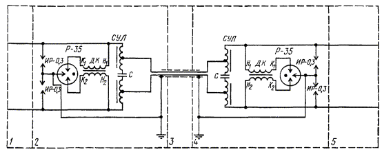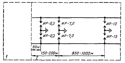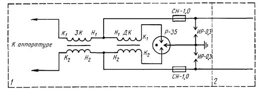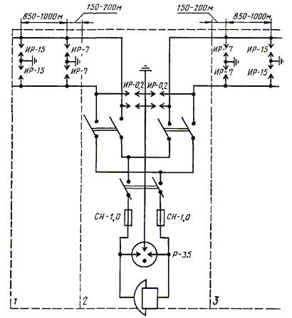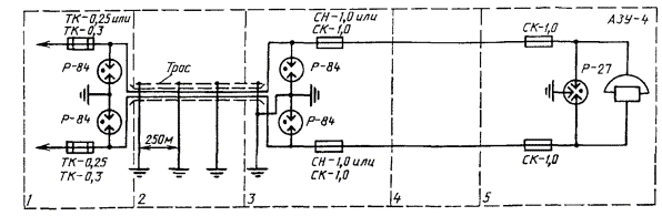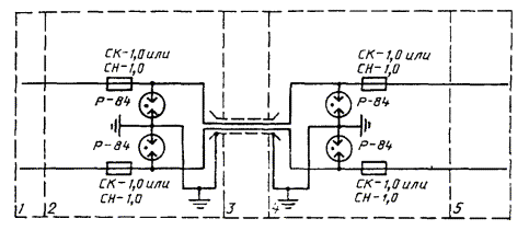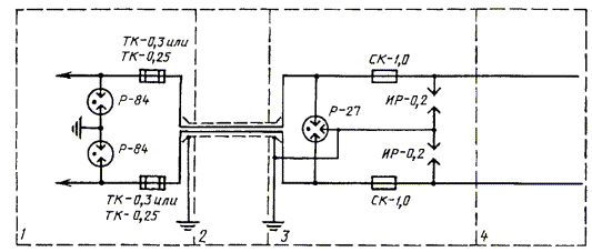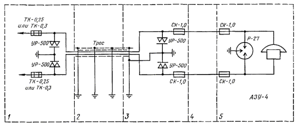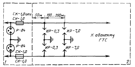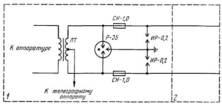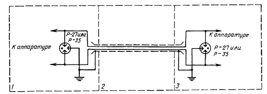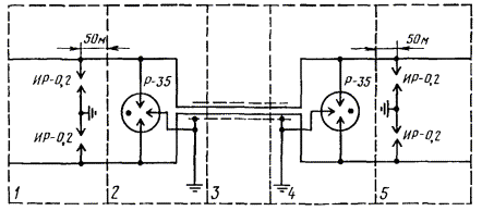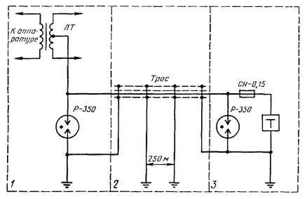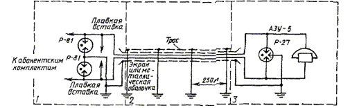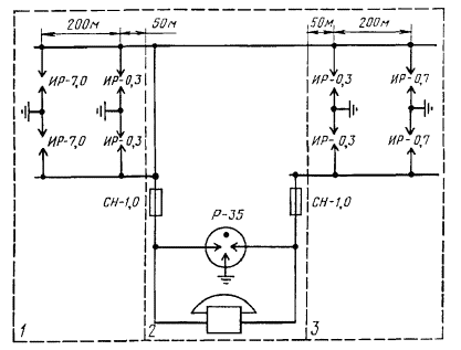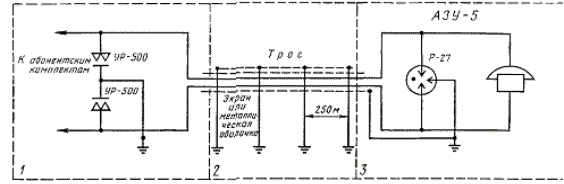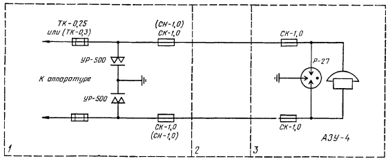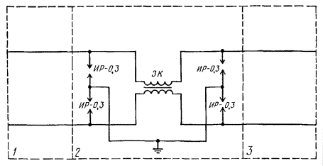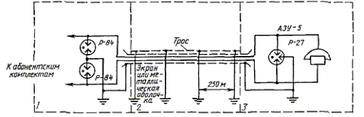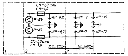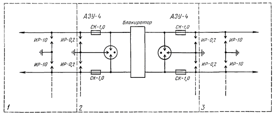 1 - телефонная станция; 2 - воздушная линия; 3 - абонентский пункт Черт. 21а 4.3. Кабельные вставки на воздушных линиях сельской связи должны быть защищены по схеме на черт. 18. 4.4. На подходе воздушных линий к телефонным станциям, а также к кабельным вводам и кабельным вставкам на каждой цепи должны быть включены искровые разрядники по схеме на черт. 22. При этом, если длина воздушной линии менее 2 км, включение разрядника типа ИР-15 не требуется. Примечание. Искровые разрядники ИР-0,3, указанные в схеме на черт. 22, могут быть включены на станции или на кабельной опоре совместно с разрядниками типа УР-500 или Р-27, как показано на схеме черт. 23 или 20, при этом воздушный промежуток должен быть уменьшен до 0,2 мм. На сельской телефонной сети в этих случаях разрядники УР-500 должны быть заменены на разрядники Р-84 по схеме черт. 20 и 23. 1 - телефонная станция, кабельная опора; 2 - воздушная линия связи Черт. 22 1 - телефонная станция, кабельный ввод; 2 - кабельная опора; 3 - воздушная линия Черт. 23 4.5. Блокираторы, установленные на воздушных линиях сельской связи, должны быть защищены предохранителями и разрядниками по схеме на черт. 24. Допускается применение АЗУ-2 (вместо АЗУ-4) с заменой в них угольных разрядников УР-500 на металлокерамические разрядники Р-84. 4.4, 4.5. (Измененная редакция, Изм. № 1). 4.6. (Исключен, Изм. № 1). 1, 3 - воздушная линия; 2 - пункт установки блокиратора (сельсовет, правление колхоза) Черт. 24 4.7. Оборудование соединительных линий межстанционной связи (неуплотненных или уплотненных аналоговыми системами передачи с напряжением дистанционного электропитания НУП, не превышающим 60 В) должно быть защищено разрядниками и предохранителями: 1) включенное в кабельные линии (подземные и подвесные) с металлической и пластмассовой оболочкой - по схеме черт. 25. Наряду с трехэлектродными разрядниками типов Р-35 и Р-27 могут применяться двух- и трехэлектродные металлокерамические с номинальным значением статического напряжения зажигания 350 В. Применяемые в составе ВКУ сельских АТС координатной системы разрядники типа Р-350 могут быть оставлены до частичной или полной реконструкции станций; 2) включенное в воздушные линии - по схеме черт. 2. На входе соединительной линии на станцию и по схеме черт. 8 на подходе воздушной линии к станции или к кабельной опоре. В схемах на черт. 2 допускается применение разрядников Р-27. При напряжении дистанционного электропитания св. 60 В (до 450 В) разрядники типов Р-35, Р-27 и др. (см. черт. 2, 25) должны быть заменены на разрядники с более высоким напряжением пробоя и погасания. 4.8. Схемы и приборы защиты аппаратуры систем передачи, которые могут быть включены в тракты высокой и низкой частот, определяют при разработке систем передачи и указывают в НТД на аппаратуру. 4.7, 4.8. (Измененная редакция, Изм. № 1). 1, 3 - телефонная станция; 2 - кабельная линия (подземная или подвесная) Черт. 25 4.9. Металлическая оболочка, экран кабелей с пластмассовой оболочкой и трос подвесных кабелей сельской связи должны быть заземлены в начале и в конце кабельной линии, а также через каждые 250 м по населенному пункту и через 2 км между населенными пунктами. 4.10. В абонентских пунктах, включенных в телефонные станции типа АТСУ 50/200 М, при новом строительстве или развитии сельской телефонной сети, а также при замене в абонентских пунктах разрядников типа УР-500 на разрядники Р-27 должны быть ус