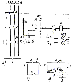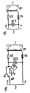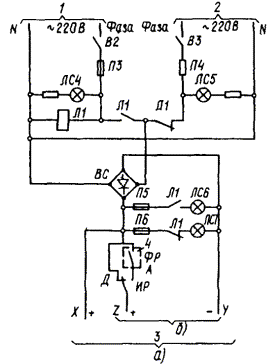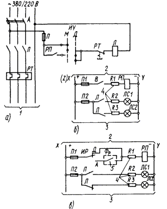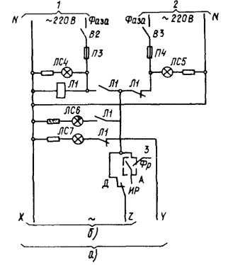 Черт. 2. Принципиальные схемы дистанционного, фотоавтоматического и программного управления освещением по свободным жилам телефонных кабелей а + б - дистанционное управление; а + в - фотоавтоматическое или программное управление; 1 - к потребителю; 2 - от источника питания сети управления 60 В (см. схемы черт. 6, 7); 3 - к аналогичным цепям управления других пускателей; 4 - вводятся в случаях, если напряжение источника питания выше, чем напряжение катушки реле и сигнальной лампы; 5 - замкнут при включении освещения фото- или программным автоматом Черт. 3. Принципиальные схемы дистанционного, фотоавтоматического и программного управления освещением по контрольным кабелям без промежуточных реле а + б - дистанционное управление; а + в - фотоавтоматическое и программное управление; 1 - к потребителю; 2 - замкнут при включении освещения фото- или программным автоматом Черт. 4. Принципиальные схемы дистанционного, фотоавтоматического и программного управления освещением по контрольным кабелям с промежуточным реле а + б - дистанционное управление; а + в - фотоавтоматическое или программное управление; 1 - к потребителю; 2 - от источника питания сети управления ~ 220 В (см. черт. 8); 3 - к аналогичным цепям управления других пускателей; 4 - замкнут при включении освещения фото- или программным автоматом Черт. 5. Принципиальная схема телемеханического управления освещением 1 - к потребителю; 2 - из схемы телеуправления; 3 - замкнут при подаче команды на включение или отключение; 4 - замкнут при подаче команды на включение; 5 - замкнут при подаче команды на отключение; 6 - двухпозиционное реле; 7 - цепь телесигнализации Черт. 6. Принципиальная схема питания сети управления постоянным током от аккумуляторной батареи а - при дистанционном, фотоавтоматическом и программном управлении каждым пускателем; б - при дистанционном управлении каждым пускателем и фотоавтоматическом или программном управлении группой пускателей; 1 - от аккумуляторной батареи или выпрямительного устройства 60 В; 2 - к схемам черт. 2, б, 2, в; 3 - к схеме черт. 2, б; 4 - замкнут при включении освещения фото- или программным автоматом Черт. 7. Принципиальная схема питания сети управления от выпрямителя а - при дистанционном, фотоавтоматическом и программном управлении каждым пускателем, к схемам черт. 2, б, 2, в; б - при дистанционном управлении каждым пускателем и фотоавтоматическом или программном управлении группой пускателей, к схеме черт. 2, б; 1 - основное питание ~ 220 В; 2 - резервное питание ~ 220 В; 3 - постоянный ток 60 В; 4 - замкнут при включении освещения фото- или программным автоматом Черт. 8. Принципиальная схема питания сети управления переменным током а - при дистанционном, фотоавтоматическом и программном управлении каждым пускателем, к схемам черт. 4, б, 4, в; б - при дистанционном управлении каждым пускателем и фотоавтоматическом или программном управлении группой пускателей, к схеме черт. 4, б; 1 - основное питание ~ 220 В; 2 - резервное питание ~ 220 В; 3 - замкнут при включении освещения фото- или программным автоматом Таблица 3
