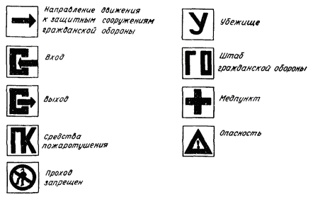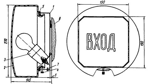 Калькодержатель и изготовитель - завод «Светотехника», г. Лихославль Калининской обл. Светильники, рекомендуемые для общего внутреннего маскировочного освещения, и маскировочные приспособления к ним 2.85. Светильники внутреннего освещения, работающие в режиме ПЗ, должны быть оборудованы маскировочными приспособлениями. Перечень светильников, рекомендуемых для общего внутреннего маскировочного освещения, и соответствующих им типов приспособлений приведены в табл. 5 и 6. 2.86. Перечень специальных светильников, предназначенных для работы в режиме ПЗ как внутри помещений, так и на открытом воздухе, приведен в табл. 7. Световые знаки, работающие в режиме ПЗ. Типы, устройство, установка 2.87. На территориях городов, населенных пунктов, промышленных предприятий, в общественных и производственных зданиях для обозначения путей эвакуации людей, помещений убежищ, служб ГО, медицинских пунктов и т.д. в режиме ПЗ используются специальные световые знаки. Перечень световых знаков и их вид указаны на черт. 9, а начертание символики - на черт. 10. Наряду с символами допускается использование световых знаков в виде надписей. 2.88. В режиме ПЗ следует применять световые знаки, удовлетворяющие следующим требованиям: размеры и яркость устанавливаемых снаружи световых знаков должны обеспечить их видимость на фоне с яркостью до 0,05 кд/м2 с расстояния 25 - 30 м. Символика знаков при той же яркости должна различаться с расстояния не менее 10 м. Освещенность, создаваемая знаками в зоне их расположения, не должна быть более 0,2 лк; размеры и яркость устанавливаемых внутри зданий световых знаков должны обеспечивать их видимость на фоне с яркостью до 0,1 кд/м2 с расстояния 25 м и различимость символики с расстояния до 10 м. Освещенность, создаваемая знаками в зоне их расположения, должна быть не более 0,5 лк. 2.89. Световые знаки, указанные в п. 2.88, должны приводиться в действие и включаться одновременно с наружным и внутренним маскировочным освещением. Знаки должны присоединяться к сетям наружного и внутреннего освещения, не отключаемым в режиме ПЗ, или иметь автономное питание. Для обозначения путей эвакуации людей к защитным сооружениям, входов в помещения и выходов из них и т.д. применяется световой указатель с лампой накаливания ТУ СХ-05-84 (черт. 11). Световой указатель рассчитан для работы на открытом воздухе и в помещениях с нормальной средой и имеет следующие технические данные: рабочее напряжение - 220 В; частоту питания сети - 50 Гц; лампу накаливания - В 220-15-1; мощность лампы - 15 Вт; число ламп - 1; яркость - не более 10 кд/м2; видимость - 25 - 30 м; массу - не более 2,6 кг; габаритные размеры - 270 ´ 145 мм. Завод-изготовитель и калькодержатель документации - Бельцкий завод электроосветительной арматуры, г. Бельцы Молдавской ССР. 2.90. Монтаж и подключение светового указателя производится электриком. При монтаже, а также при устранении неисправностей сеть должна быть обесточена. При подготовке к работе (см. черт. 11) необходимо: шнур ПРС 2 ´ 0,75 предварительно подготовить и ввести в отверстие на корпусе 1, присоединив к патрону 3; ввернуть лампу накаливания мощностью 15 Вт; установить рассеиватель-колпак 2 с кольцом-прокладкой 5, поджав рассеиватель равномерно винтами 4 до упора, а затем отвернуть винты на полоборота; закрепить на стене скобу-крепление 6 и установить световой указатель; заземлить св