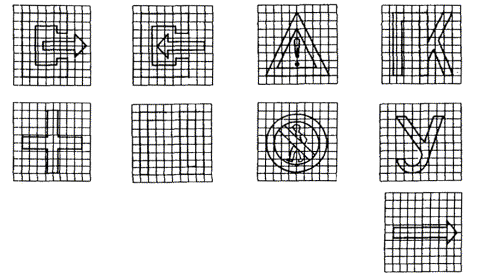 Черт. 9. Световые знаки, работающие в режиме ПЗ Черт. 10. Начертание символов световых знаков в модульной сетке Таблица 7