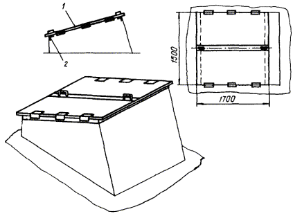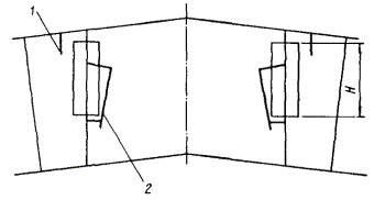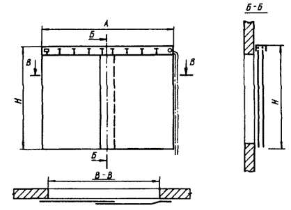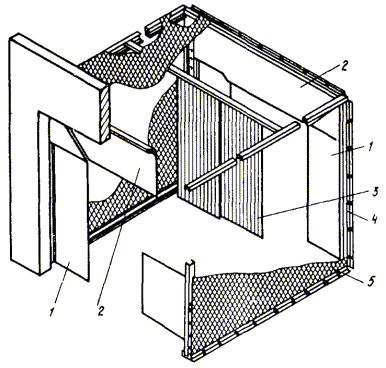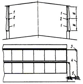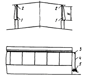 3.21. Номенклатура и техническое решение штор-экранов аэрационных фонарей ША приведены на черт. 22 и 23. Штора включает наружные стационарные экраны 1 и внутренние стационарные экраны 2, которые закрепляются к конструкциям фонаря при помощи сварки и крепежных болтовых соединений. 3.22. Номенклатура и техническое решение штор-щитов зенитных фонарей ШЗ приведены на черт. 24. Штора включает для всех серий крышки распашные 1, которые крепятся болтовыми крепежными соединениями к каркасу 2. 3.23. Номенклатура и технические решения штор ворот ШВ и штор-тамбуров ворот ШТ приведены на черт. 25 - 28. Штора ворот ШВ (см. черт. 26) включает две боковые завесы 1, одну горизонтальную завесу 2 и алюминиевый каркас 3. В тамбуре-шлюзе устанавливаются две шторы. Штора-тамбур ШТ (см. черт. 28) включает три ряда штор: две торцевые из двух боковых завес 1 и одной горизонтальной завесы 2 и одну среднюю штору из вертикальных завес 3, каркас 4 и обшивку каркаса 5. Завесы выполнены из черной эластичной резины, обшивка - из светонепроницаемой пленки. Световая маскировка ворот обеспечивается при тамбурах-шлюзах двумя воротами с двумя рядами завес, а в воротах без тамбуров-шлюзов - тремя рядами завес. При проезде транспорта завесы облегают контуры транспорта. В тамбурах-шлюзах длиной более проходящего через них транспорта шторы не устанавливаются. В этом случае светомаскировка обеспечивается шлюзованием транспорта. Светомаскировка проемов ворот, оборудованных шторами-тамбурами ШТ, обеспечивается в комплексе со светотехническими мероприятиями в зоне ворот. Черт. 22. Номенклатура штор-экранов аэрационных фонарей ША для серии КТИС