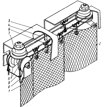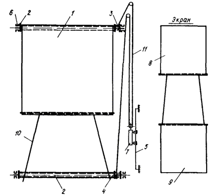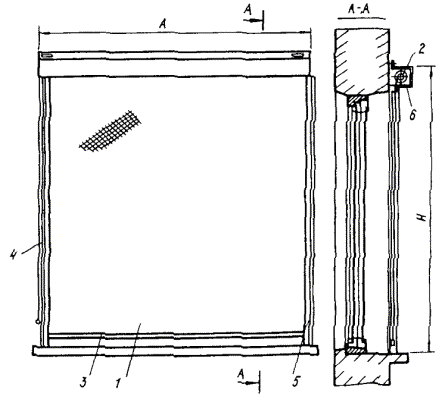 Черт. 11. Световой указатель 1 - корпус; 2 - колпак; 3 - патрон; 4 - винт; 5 - прокладка; 6 - крепление; 7 - винт заземления 3. МЕХАНИЧЕСКИЕ УСТРОЙСТВА ДЛЯ СВЕТОВОЙ МАСКИРОВКИ ПРОЕМОВ ЗДАНИЙ И СООРУЖЕНИЙОСНОВНЫЕ ПОЛОЖЕНИЯ ПО МАСКИРОВКЕ СВЕТОВЫХ, АЭРАЦИОННЫХ И ТЕХНОЛОГИЧЕСКИХ ПРОЕМОВ ЗДАНИЙ И СООРУЖЕНИЙ 3.1. Световая маскировка проемов зданий и сооружений, в которых продолжается работа в режиме ПЗ, проводится с целью полного устранения или уменьшения до безопасных пределов световых потоков, выходящих наружу через указанные проемы. 3.2. Световая маскировка осуществляется путем установки на оконных проемах механических зашторивающих устройств с учетом специфики и особенностей производства. 3.3. Изготовление и подготовка к установке механических устройств проводятся заблаговременно в мирное время. Установка механических устройств на штатные места выполняется при введении режима ЧЗ. Если на монтаж отдельных устройств требуется время, превышающее 16 ч, то их установка производится в мирное время. Механические зашторивающие устройства вводятся в действие по специальному распоряжению. Время введения в действие устройств не должно превышать 3 мин. 3.4. Механические устройства устанавливаются только в тех помещениях промышленных и общественных зданий (сооружений), где по условиям работы, продолжающейся в режиме ПЗ, требуются уровни освещенности, превышающие 0,5 лк для общего и 5 лк для местного освещения. В помещениях, оборудованных светомаскировочным освещением, механические зашторивающие устройства не устанавливаются. 3.5. Светопропускание механических устройств, т.е. отношение прошедшего через устройство светового потока к световому потоку, упавшему на него, должно быть не более 10-3. 3.6. В зашторивающих механических устройствах ширина штор не должна превышать 6 м, высота раздвижных штор - 4 м, высота подъемных штор - 5 м. При более высоких окнах верхнюю часть проема, превышающую 5 м, следует заделывать наглухо светонепроницаемым материалом или покрытием, наносимым на остекление (пленки, краски), если это допускается по условиям технологии производства (прил. 18). 3.7. В качестве светонепроницаемого материала для зашторивающих устройств рекомендуется применять двухслойную полиэтиленовую пленку специального назначения ТУ 6-19-051-526-84 и светомаскировочную бумагу (прил. 18). Указанные материалы являются самозатухающими. 3.8. Зашторивающие устройства не следует устанавливать в промышленных зданиях вблизи мощных источников теплового излучения. В этом случае следует использовать экраны из негорючих материалов. 3.9. Перед установкой штор-экранов и штор-щитов в светоаэрационные и аэрационные фонари необходимо провести расчет дополнительных создаваемых ими весовых нагрузок на конструкцию здания. 3.10. Ворота и въезды в промышленные здания, через которые может осуществляться движение транспорта в режиме ПЗ, оборудуются, как правило, тамбурами-шлюзами со светомаскировочными завесами из эластичного материала. 3.11. Конструкции механических устройств рассчитываются на ветровые воздействия до 200 Н/м2. Прочность крепления каркаса устройств к конструкциям здания должна проверяться силой 500 Н, приложенной к местам крепления. Несущие конструкции устройств рекомендуется выполнять из негорючих материалов. 3.12. Механические устройства не должны препятствовать о
